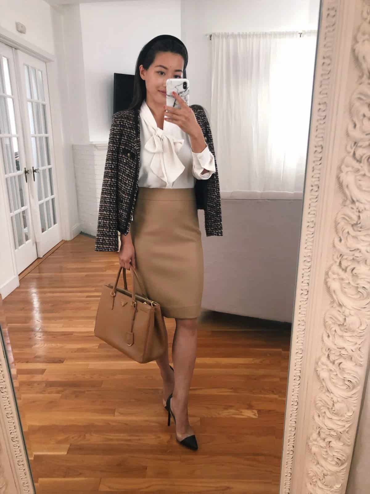 This sophisticated ensemble perfectly balances professionalism with autumn flair. The tweed blazer adds a touch of texture and warmth, ideal for cooler fall days, while the camel pencil skirt offers a sleek silhouette. The white bow-tie blouse underneath brings a feminine touch, softening the overall look. Accessorized with a matching tan handbag and classic black pumps, this outfit exudes confidence and style. The neutral color palette is versatile and seasonally appropriate, making it a go-to choice for impressing clients or nailing that big presentation. This look demonstrates how to seamlessly incorporate fall textures and tones into a polished office wardrobe.