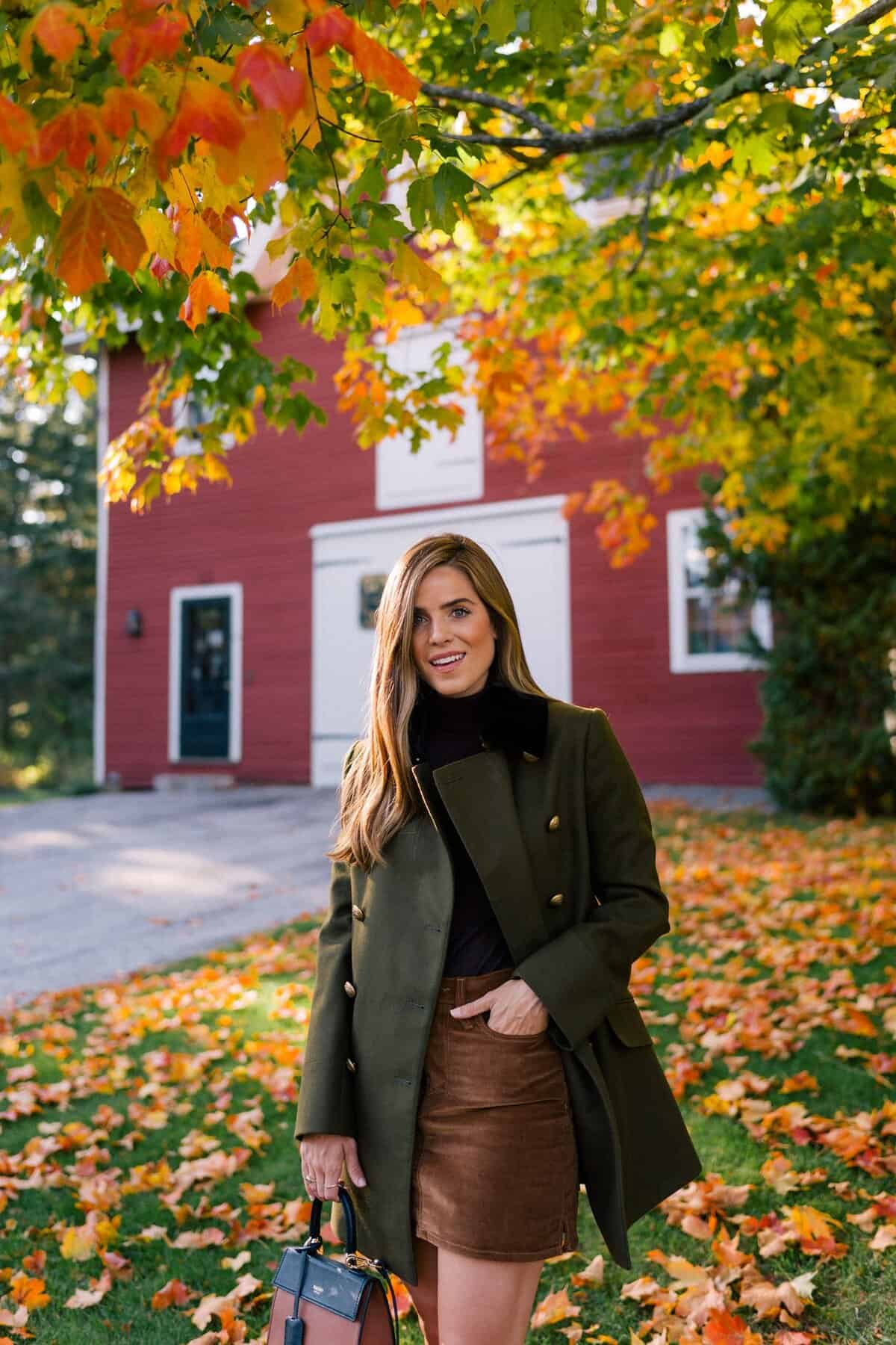 This ensemble perfectly captures the essence of fall fashion while maintaining a professional edge. The olive green military-style coat adds a touch of sophistication and warmth, ideal for crisp autumn days at the office. Paired with a sleek black turtleneck and a brown suede skirt, this outfit strikes the perfect balance between chic and work-appropriate. The rich, earthy tones complement the vibrant fall foliage backdrop, creating a harmonious look that’s sure to turn heads. Accessorized with a structured handbag, this outfit demonstrates how to seamlessly blend seasonal trends with office attire, making it a standout choice for fashion-forward professionals.