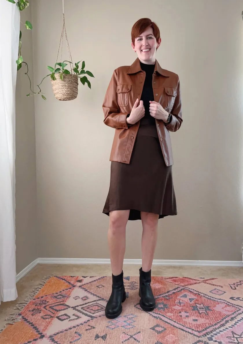 This ensemble exemplifies the perfect balance of professional and trendy for the fall season. The rich, caramel-colored leather jacket adds a touch of sophistication and warmth, ideal for cooler office temperatures. Paired with a sleek black turtleneck and a chocolate brown midi skirt, the outfit creates a harmonious color palette that screams autumn. The ankle boots provide a stylish yet practical finishing touch, suitable for navigating busy workdays. This look demonstrates how to incorporate seasonal textures and hues into a work-appropriate outfit that’s both comfortable and chic, guaranteed to make a lasting impression in any professional setting.