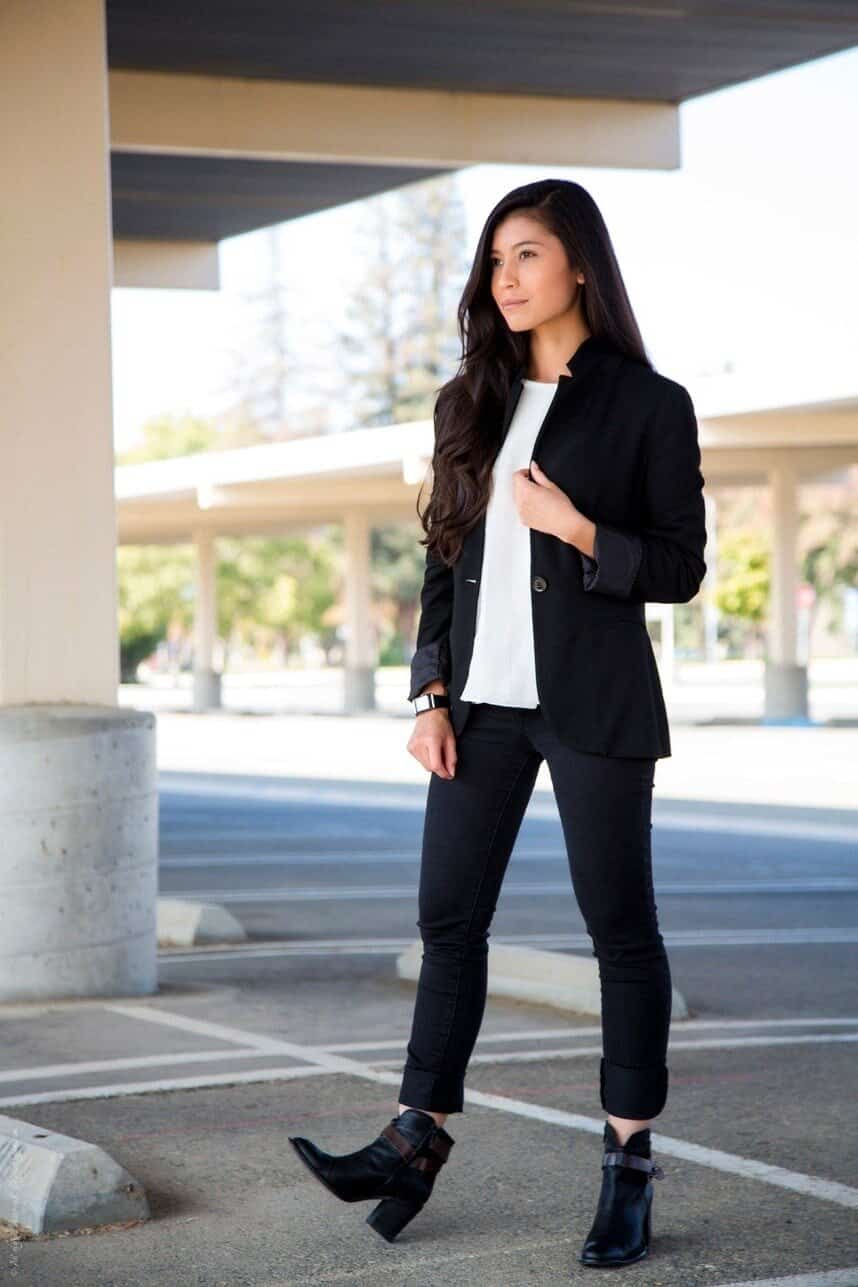 This sophisticated monochrome outfit epitomizes fall fashion for the modern professional. The crisp white top layered under a tailored black blazer creates a sharp contrast that’s both classic and contemporary. Paired with sleek black skinny pants and ankle boots, this ensemble offers a perfect balance of comfort and style. The blazer’s structured silhouette adds a touch of authority, while the fitted pants elongate the figure, creating a polished look from head to toe. This versatile combination is ideal for navigating cooler autumn days in the office, easily transitioning from client meetings to after-work events with effortless grace. It’s a testament to the enduring power of a well-executed black and white palette in professional attire.