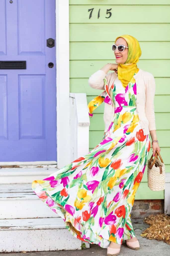 Embrace the transition from summer to fall with this stunning floral maxi dress paired with a light cardigan. The dress’s vibrant tulip print in shades of pink, yellow, and orange brings a cheerful pop of color to cooler days, while the cream-colored cardigan adds warmth and modesty. A bright yellow hijab complements the dress perfectly, creating a cohesive and eye-catching ensemble. Nude pumps and a woven handbag complete this chic look, demonstrating how hijabi fashion can be both modest and fashion-forward for autumn. This outfit is ideal for those seeking to maintain a colorful wardrobe while adapting to fall’s cooler temperatures.