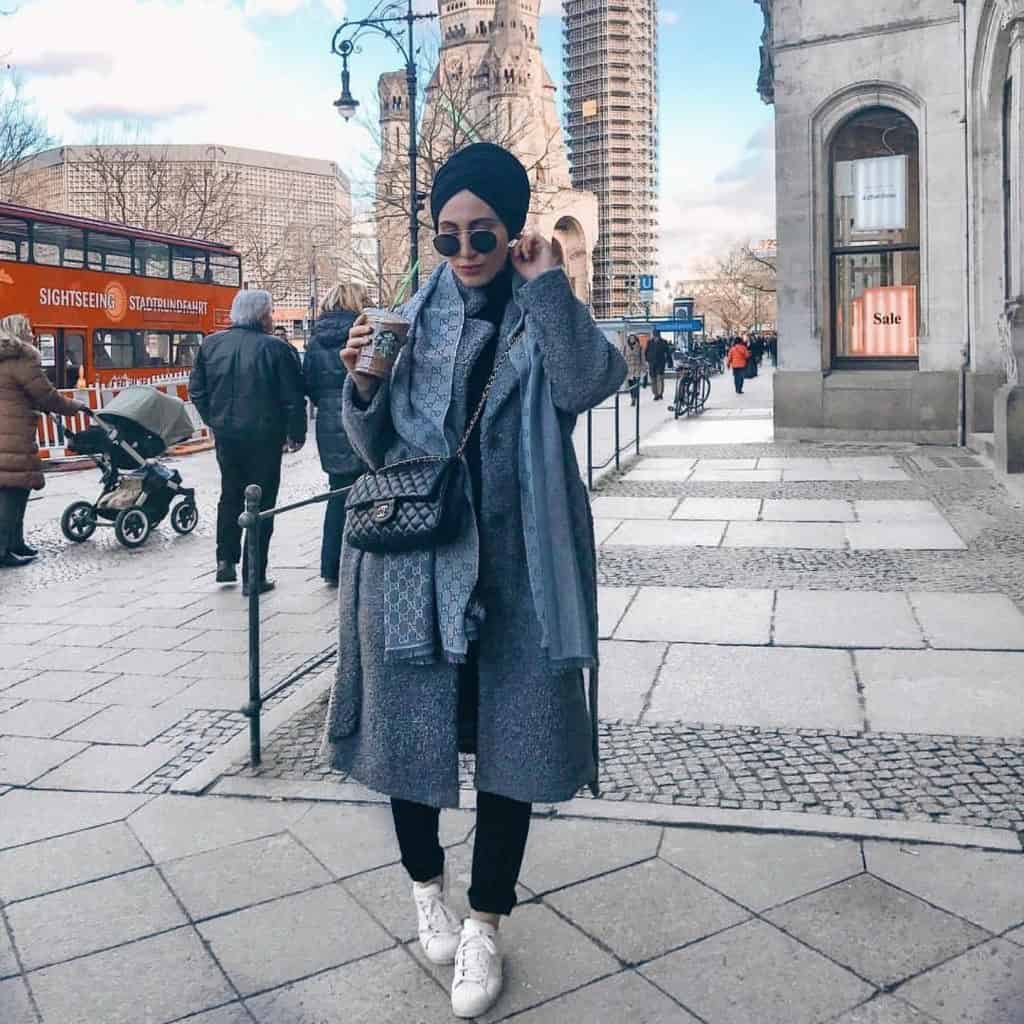 This sophisticated ensemble perfectly captures the essence of modest fall fashion in an urban setting. The long gray coat, layered over a matching scarf and black hijab, creates a sleek monochromatic look that’s both stylish and practical for cooler days. The outfit’s modesty is maintained while still showcasing a keen sense of style, with the addition of trendy sunglasses and a classic quilted handbag. White sneakers add a modern, comfortable touch, ideal for city exploration. This look demonstrates how hijabi fashion can seamlessly blend modesty with contemporary urban style, making it a versatile choice for autumn outings in the city.