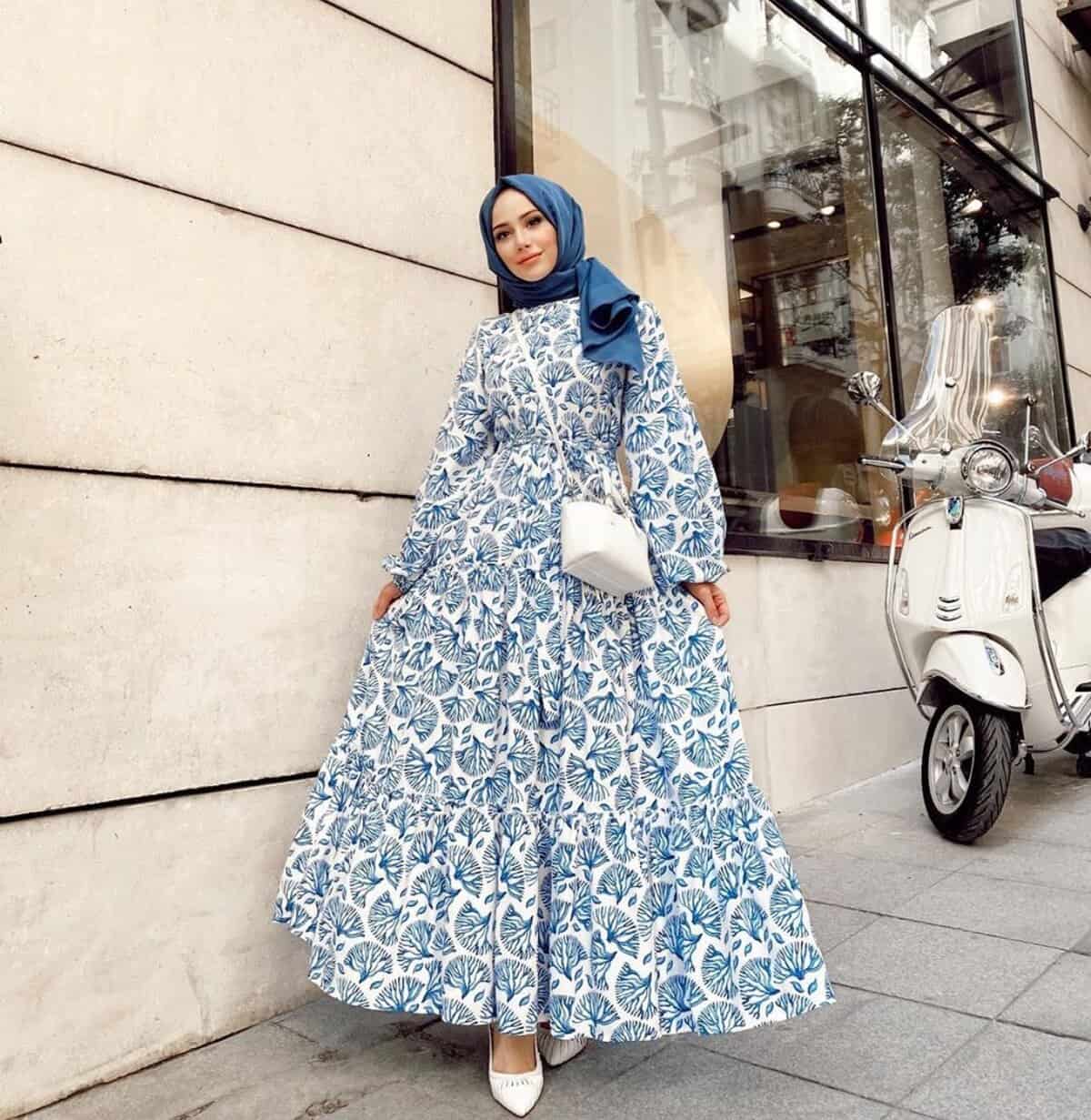 This stunning ensemble showcases a perfect blend of modesty and style for the fall season. The long-sleeved maxi dress features a beautiful blue and white floral print, ideal for transitioning from summer to autumn. The flowing silhouette offers both comfort and elegance, while the matching blue hijab completes the look with a cohesive color palette. Paired with white pointed-toe flats and a small white handbag, this outfit demonstrates how to incorporate lighter colors into your fall wardrobe while maintaining a chic and modest appearance. The overall effect is fresh, feminine, and perfectly suited for cool autumn days in the city.