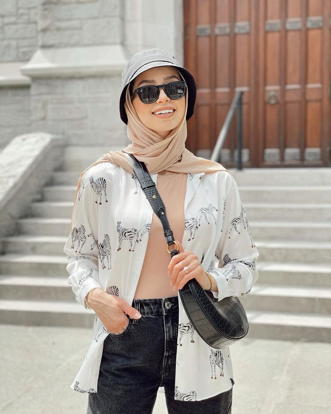 This outfit seamlessly blends modest fashion with contemporary style, perfect for crisp autumn days. The standout piece is a whimsical white button-up shirt adorned with zebra prints, adding a touch of personality to the ensemble. Paired with classic black jeans, it strikes an ideal balance between fun and sophistication. The look is accessorized thoughtfully with a neutral-toned hijab, sleek sunglasses, and a trendy bucket hat, demonstrating how hijabi fashion can incorporate current trends. A chic black crossbody bag completes the outfit, making it practical for everyday wear. This combination showcases how modest dressing can be both stylish and expressive, ideal for the fashion-forward hijabi looking to make a statement this fall.