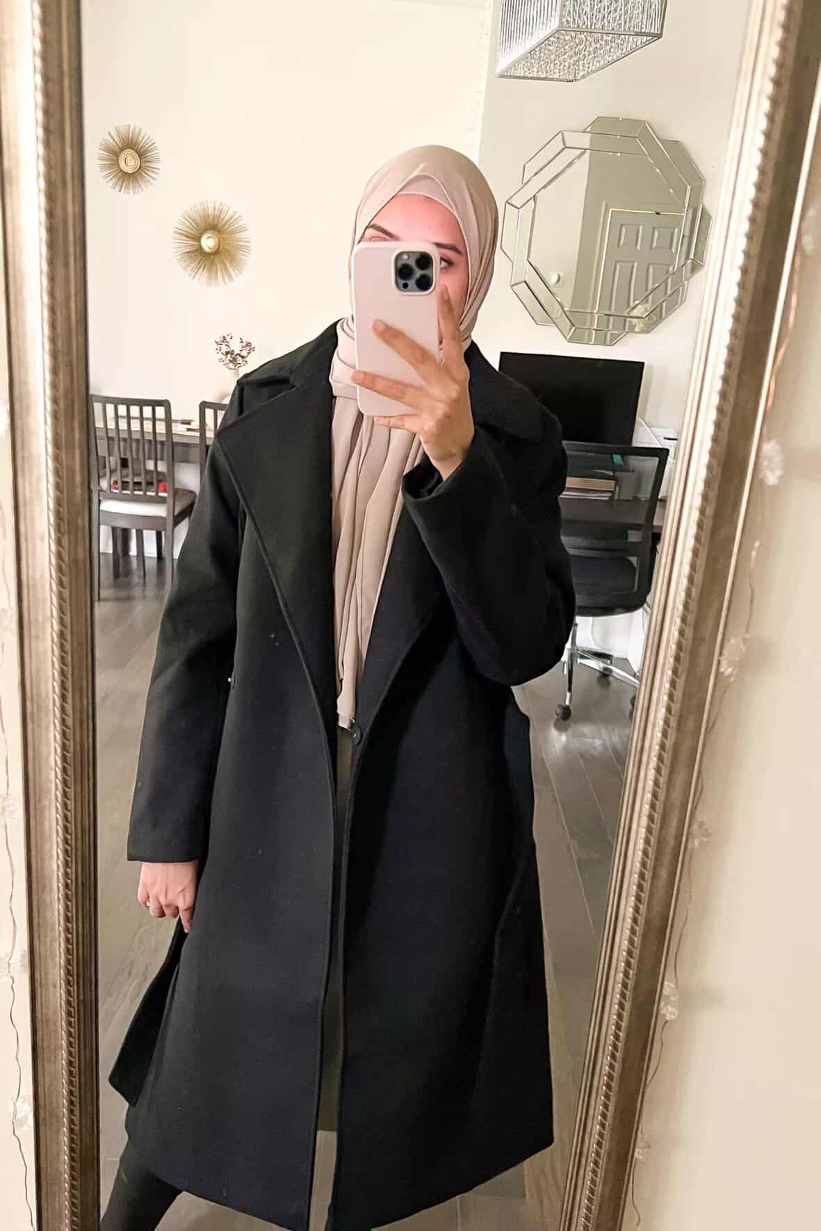 This ensemble epitomizes the perfect balance of modesty and style for cooler autumn days. The long, sleek black coat offers both warmth and a timeless silhouette, ideal for layering over fall outfits. Its clean lines and tailored fit create a polished look suitable for various occasions. The blush-toned hijab adds a soft, feminine touch, beautifully complementing the coat’s dark hue. This color combination is quintessentially autumnal, evoking the season’s cozy yet chic aesthetic. The outfit demonstrates how hijabi fashion can seamlessly incorporate current trends while maintaining modesty, making it a versatile choice for the fashion-conscious Muslim woman navigating fall’s crisp temperatures.