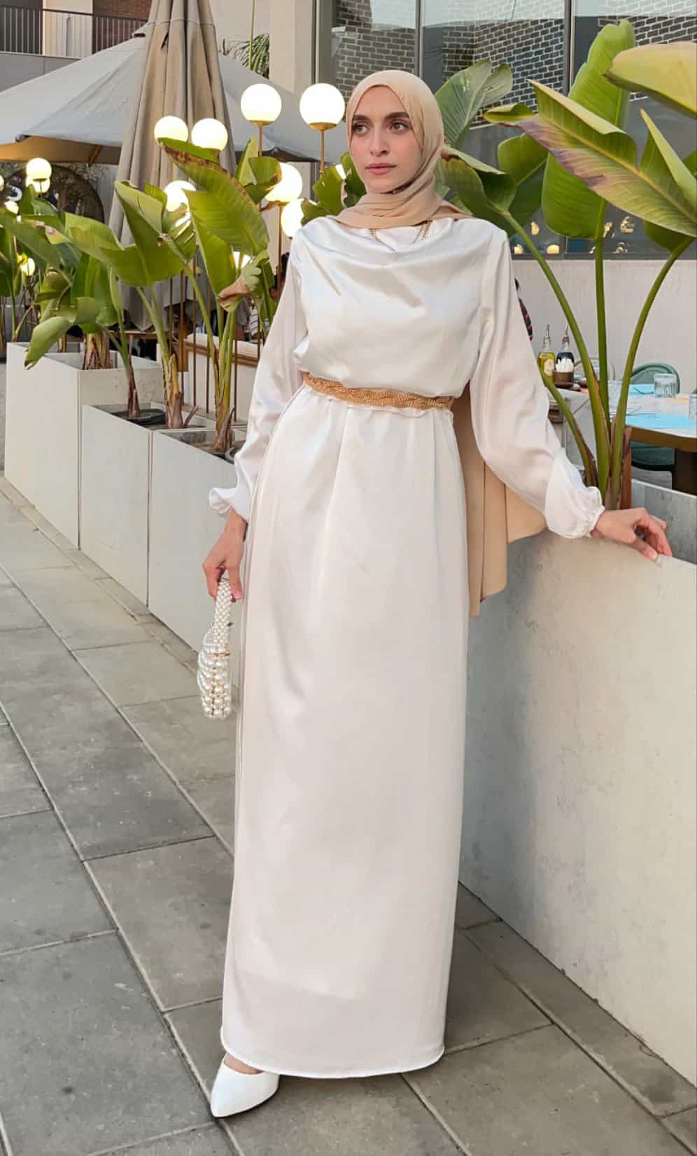 This stunning white maxi dress outfit is the epitome of modest elegance for fall. The flowing, long-sleeved dress in a soft cream hue offers full coverage while maintaining a chic silhouette. Cinched at the waist with a delicate golden belt, it creates a flattering shape without compromising on modesty. The neutral beige hijab complements the dress perfectly, creating a cohesive look. Accessorized with a pearl-embellished handbag, this ensemble demonstrates how autumn fashion can be both cozy and sophisticated. The outfit’s versatility makes it suitable for various autumn occasions, from casual outings to more formal events, embodying the essence of modest yet fashionable fall attire.