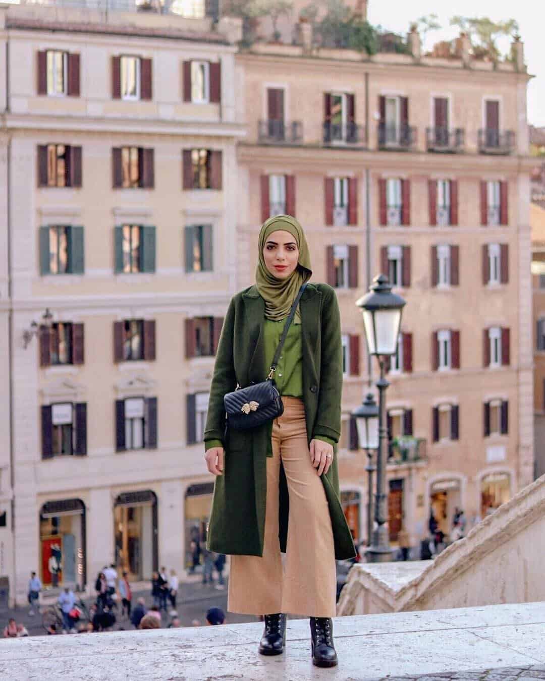 This ensemble perfectly embodies the essence of chic hijabi fall fashion with its harmonious blend of autumnal hues and modest styling. The long olive green coat serves as the centerpiece, offering both warmth and sophistication for cooler days. Layered over a lighter green top, it creates a pleasing tonal effect that’s both trendy and timeless. The wide-leg camel trousers add a touch of retro-inspired elegance while maintaining a contemporary silhouette. Accessorized with a sleek black crossbody bag and sturdy ankle boots, this outfit strikes the ideal balance between comfort and style for the fashion-forward hijabi navigating city streets during the fall season.