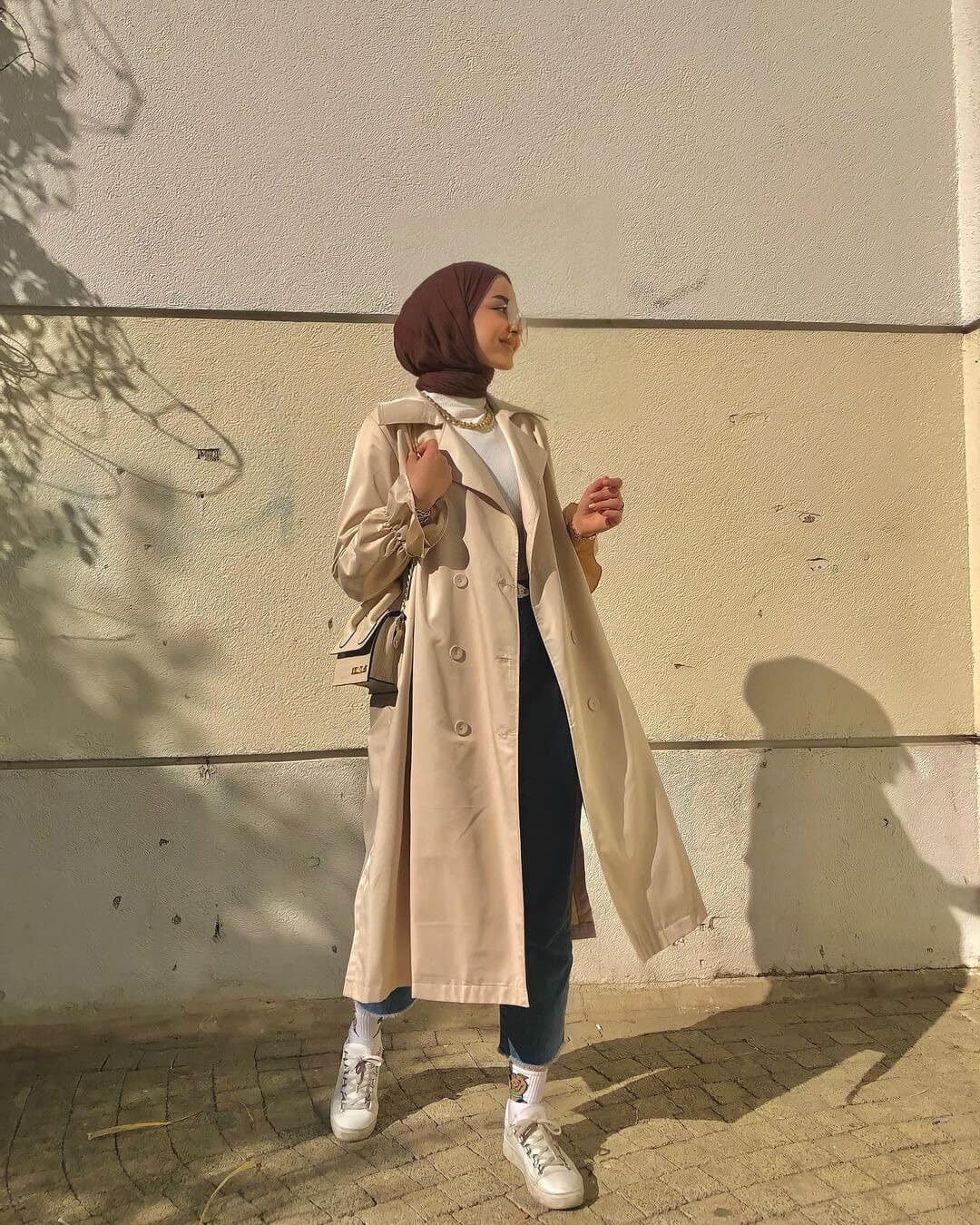 This ensemble perfectly embodies the essence of modest yet trendy fall fashion. The long, cream-colored trench coat serves as the centerpiece, offering both style and warmth for cooler autumn days. Paired with a dark hijab and white turtleneck, the outfit strikes a beautiful balance between light and dark tones. The relaxed-fit jeans and white sneakers add a casual, comfortable touch to the look, making it ideal for everyday wear. Accessorized with a delicate gold necklace and a small handbag, this outfit demonstrates how hijabi fashion can be both elegant and practical for the fall season. It’s a versatile look that can easily transition from day to night, embodying the cozy yet chic aesthetic of autumn.