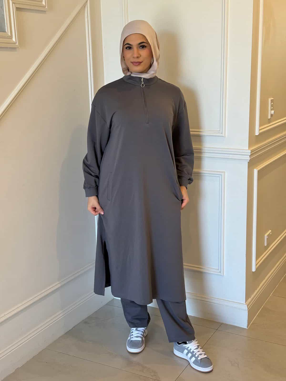 This outfit perfectly blends comfort and style for the modern hijabi’s fall wardrobe. The long, charcoal grey maxi dress with a quarter-zip neckline offers a sporty yet elegant silhouette, ideal for cooler autumn days. Paired with matching wide-leg pants, it creates a cohesive, monochromatic look that’s both modest and on-trend. The light beige hijab adds a soft contrast, while the grey sneakers complete the athleisure-inspired ensemble. This versatile outfit is perfect for running errands, casual outings, or even light outdoor activities, showcasing how modest fashion can be both practical and fashionable for the autumn season.