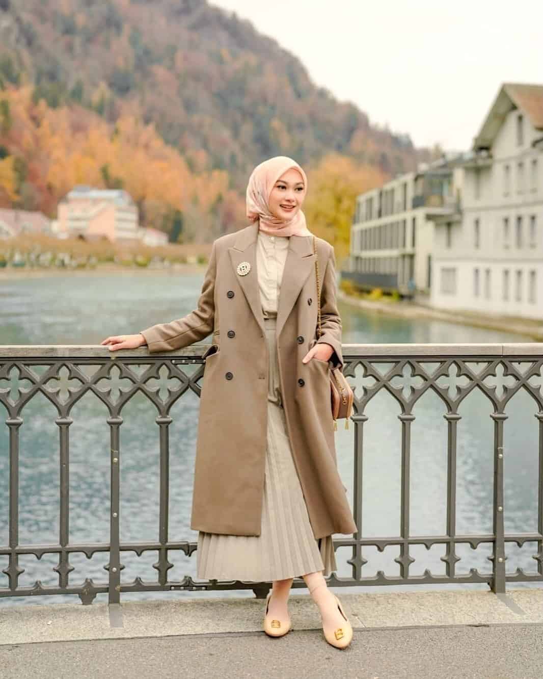 This outfit perfectly embodies autumn sophistication with its harmonious blend of neutral tones and modest elegance. The camel-colored trench coat, a timeless fall staple, provides both warmth and style while maintaining a sleek silhouette. Beneath, a cream-colored pleated skirt adds a touch of feminine grace, its length ensuring modesty without sacrificing fashion. The light pink hijab complements the outfit’s color palette beautifully, framing the face with a soft, autumnal glow. Accessories like the statement brooch and chain-strap bag elevate the look, while comfortable nude flats make it practical for a day out enjoying the crisp fall weather. This ensemble demonstrates how hijabi fashion can be both chic and cozy, ideal for those seeking modest yet trendy autumn attire.