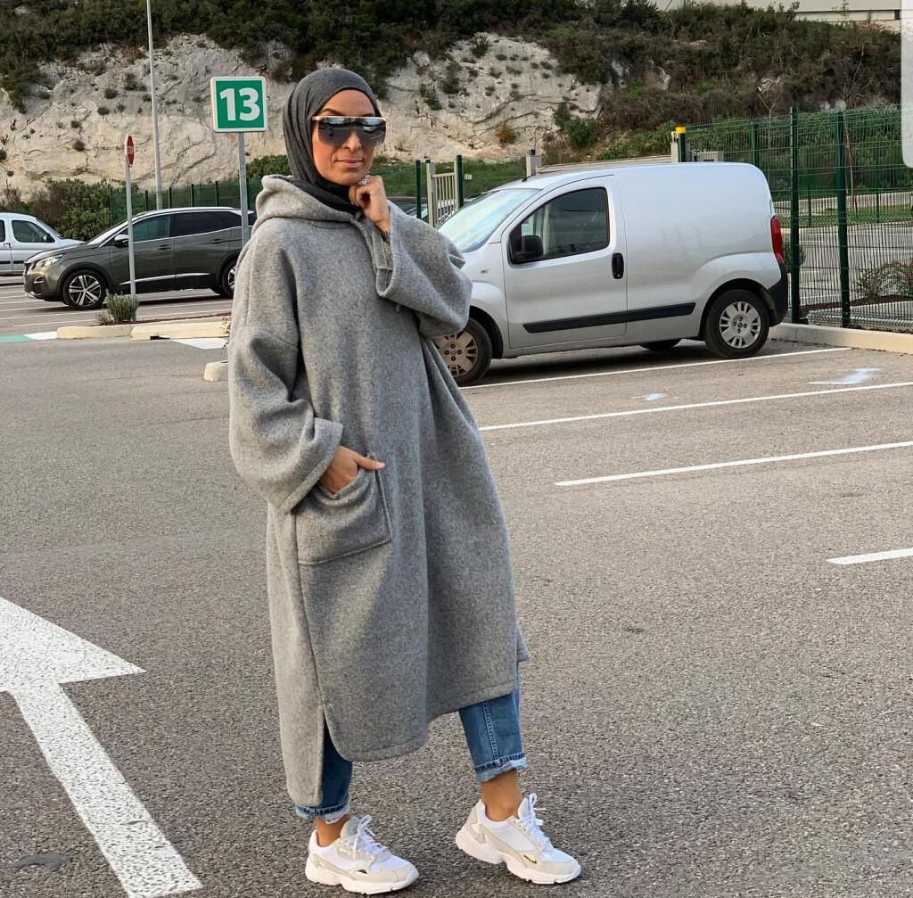 This ensemble perfectly captures the essence of chic and cozy hijabi fall fashion. The oversized gray coat is a standout piece, offering both warmth and style for those crisp autumn days. Its relaxed fit allows for easy layering, while the neutral tone complements any outfit underneath. The pairing with casual blue jeans and white sneakers adds a modern, street-style edge to the look, proving that modest fashion can be both comfortable and trendy. The dark hijab provides a sleek contrast to the lighter tones of the outfit, while the sunglasses add a touch of mystery and glamour. This outfit demonstrates how hijabi fashion can effortlessly blend modesty with contemporary trends, creating a look that’s perfect for running errands or meeting friends for a casual outing on a cool fall day.