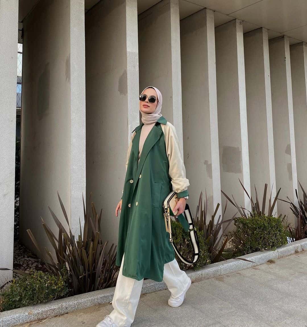 This outfit masterfully combines autumn hues with modest elegance. The standout piece is a rich forest green trench coat, its oversized silhouette providing both warmth and style. Underneath, cream-colored separates create a harmonious palette, while a blush hijab adds a soft touch. Wide-leg trousers and white sneakers balance comfort with chic. Accessories like oversized sunglasses and a striped handbag elevate the look. This ensemble demonstrates how hijabi fashion can be both cozy and sophisticated for fall, mixing timeless pieces with contemporary trends. It’s perfect for everything from campus strolls to casual office days, embodying the versatility sought after in modest autumn wardrobes.