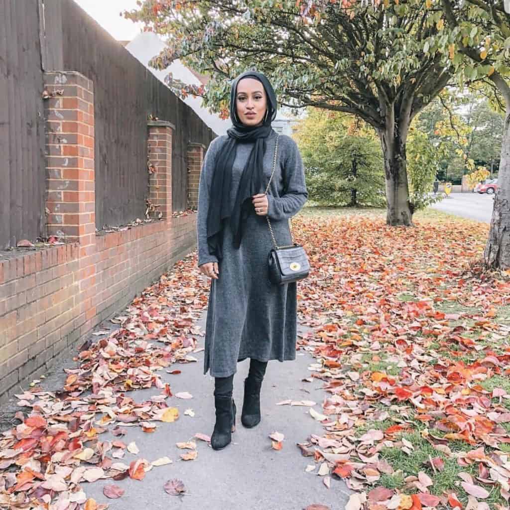 This ensemble perfectly captures the essence of chic hijabi fall fashion. The long, gray knit dress provides a sleek silhouette while ensuring modesty, ideal for cooler autumn days. Layered over it, a matching gray cardigan adds warmth and sophistication. The dark hijab, elegantly draped, complements the outfit’s color scheme while framing the face beautifully. Black ankle boots offer a practical yet stylish footwear choice, perfect for crunching through fallen leaves. A small black shoulder bag with a gold chain strap adds a touch of luxury to the look. This monochromatic outfit demonstrates how a single color palette can create a striking, put-together appearance that’s both modest and fashionable for the fall season.