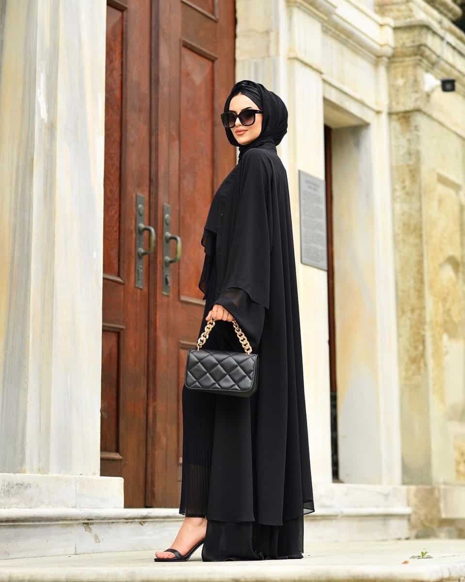 This sophisticated all-black outfit exemplifies how modest fashion can be both chic and appropriate for cooler autumn days. The flowing abaya creates a sleek silhouette while providing ample coverage and warmth. The coordinating black hijab is stylishly wrapped, complementing the overall look. Elevating the ensemble are carefully chosen accessories: oversized sunglasses add a touch of glamour, while the quilted handbag with a gold chain strap introduces a luxe element. The outfit is completed with simple black sandals, perfect for transitional weather. This look demonstrates how monochromatic dressing can be incredibly impactful, making it an ideal choice for hijabi fashion enthusiasts seeking a polished autumn style.