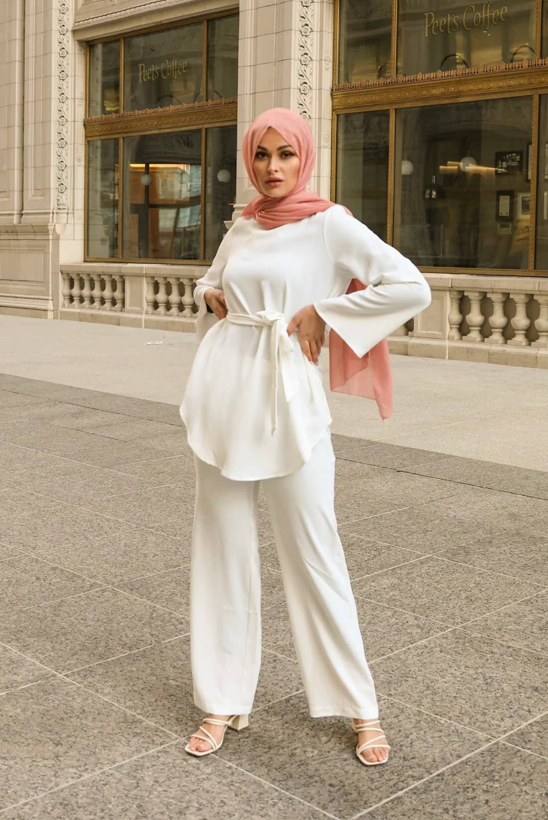 This sophisticated all-white outfit exemplifies how modest fashion can be both chic and comfortable for fall. The ensemble features a loose-fitting, belted tunic top with wide sleeves, paired with flowing palazzo pants, creating a sleek silhouette. The crisp white color is beautifully complemented by a soft pink hijab, adding a gentle touch of warmth perfect for autumn. Strappy sandals in a neutral tone complete the look, maintaining the outfit’s elegant simplicity. This combination demonstrates how monochromatic dressing can be elevated with subtle color accents, making it an ideal choice for hijabi fashion enthusiasts seeking a polished yet cozy autumn style.