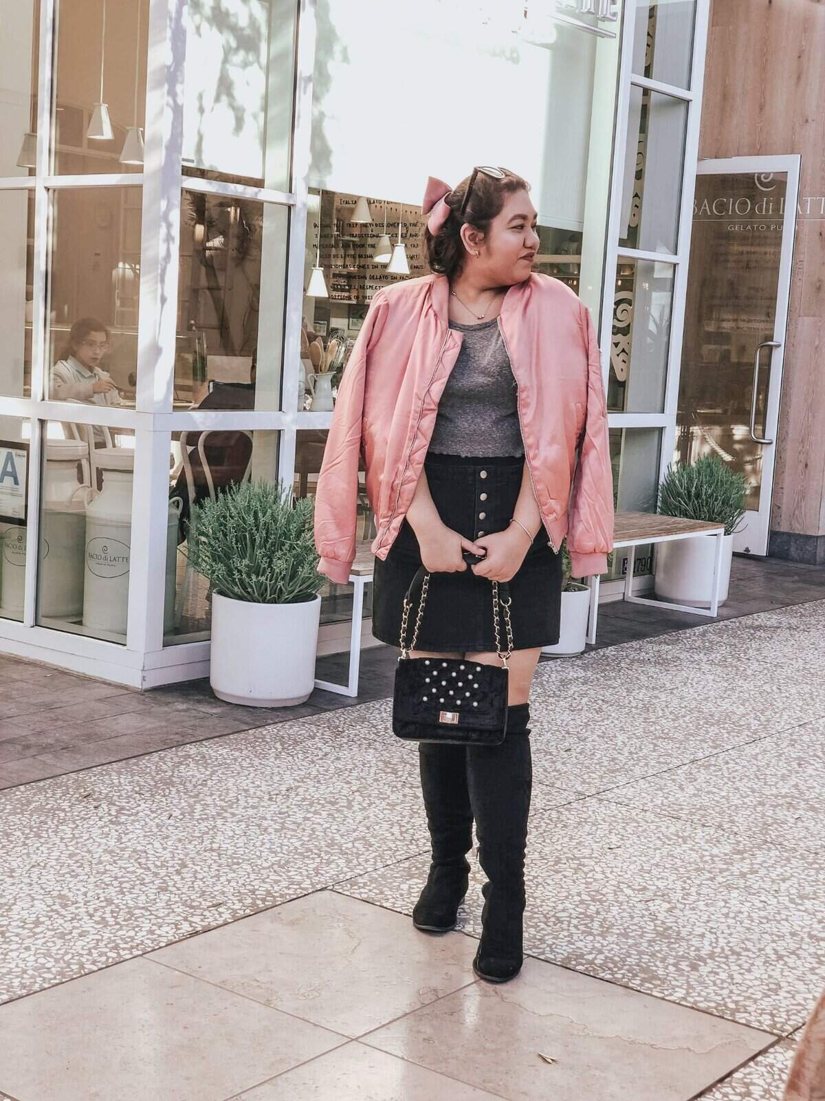This fall-ready ensemble perfectly balances comfort and style with a standout pink bomber jacket. The soft, rosy hue of the jacket adds a pop of color to the otherwise neutral outfit, making it an ideal choice for those crisp autumn days. Paired with a gray top, black button-front skirt, and over-the-knee boots, this look exudes effortless sophistication. The outfit is accessorized with a studded black handbag and a matching pink hair bow, demonstrating how small details can elevate a casual look. This combination showcases how incorporating a pink statement piece can create a chic, head-turning fall outfit that’s both fashion-forward and seasonally appropriate.