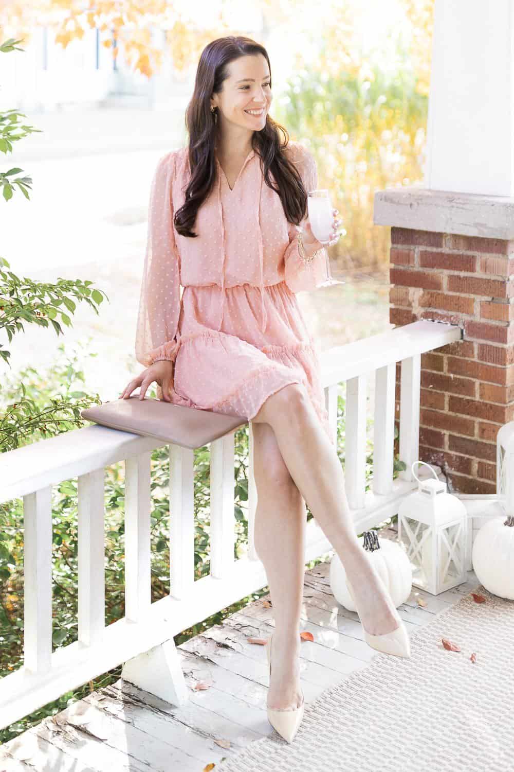 This enchanting blush pink dress embodies the perfect blend of autumn charm and feminine grace. The delicate polka dot pattern adds a playful touch to the soft, romantic hue, making it an ideal choice for fall gatherings. The tiered silhouette creates a flattering, flowy effect that moves beautifully with every step. Long sleeves provide warmth for cooler days, while the knee-length cut allows for versatile styling. Paired with neutral accessories and classic pumps, this outfit effortlessly transitions from day to evening events. The dress’s ethereal quality, combined with its autumnal pink shade, ensures you’ll turn heads while embracing the season’s softer palette.