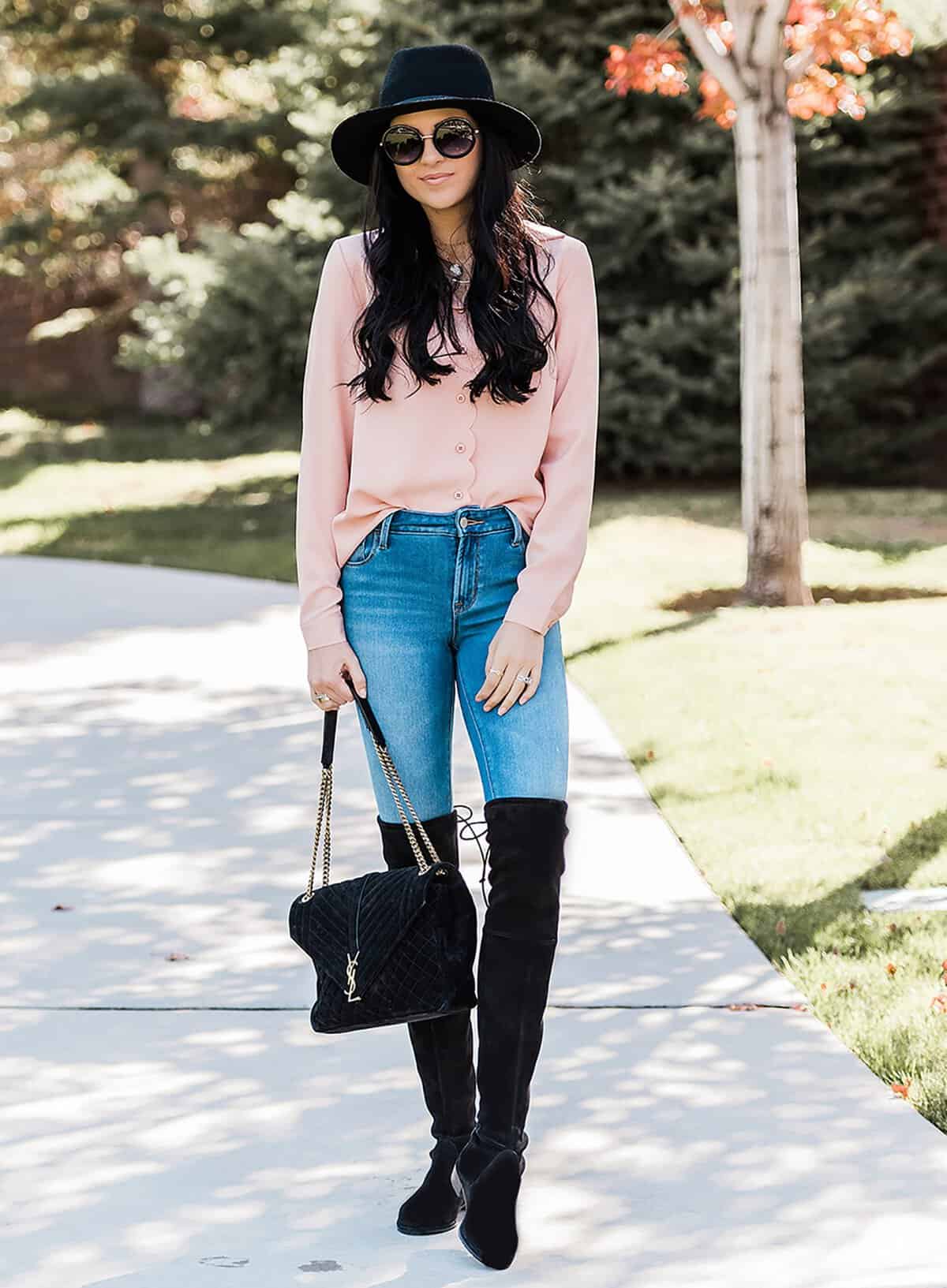 This ensemble effortlessly combines comfort and style for the perfect fall look. The soft blush pink sweater adds a delicate touch of color, perfectly complementing the crisp autumn air. Paired with classic blue jeans and chic over-the-knee black boots, this outfit strikes an ideal balance between casual and sophisticated. The black fedora and oversized sunglasses elevate the look, adding a hint of mystery and glamour. Accessorized with a sleek black designer handbag, this outfit demonstrates how a simple pink piece can be transformed into a head-turning fall ensemble. It’s a versatile look that can easily transition from day to night, making it a must-have for any fashion-forward autumn wardrobe.