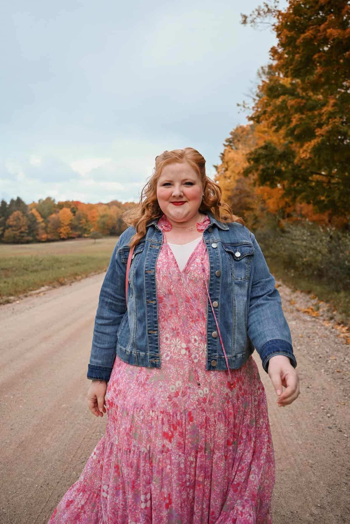 This stunning ensemble perfectly captures the essence of chic fall fashion with a touch of pink. The centerpiece is a flowing pink floral maxi dress, its delicate pattern and vibrant hue adding a romantic flair to the autumn landscape. Paired with a classic denim jacket, the outfit strikes an ideal balance between casual comfort and elegant style. The jacket’s rugged texture contrasts beautifully with the dress’s soft femininity, creating a look that’s both practical and eye-catching for cooler fall days. Accessorized with a matching pink crossbody bag, this outfit demonstrates how to incorporate pink into your fall wardrobe while maintaining a seasonal aesthetic. It’s a versatile choice that can easily transition from a casual day out to a more formal evening event.