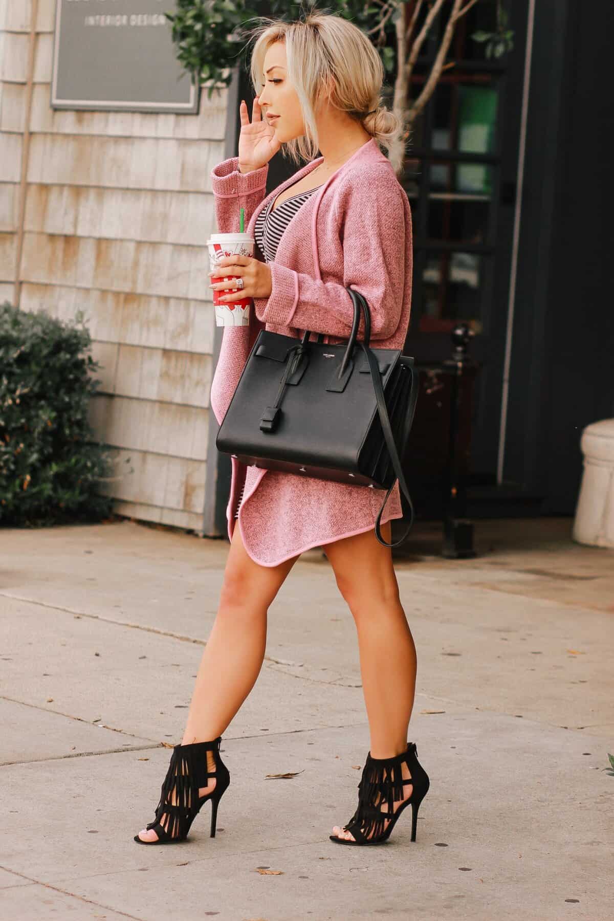 This ensemble perfectly embodies chic pink fall fashion with its cozy yet stylish appeal. The oversized dusty rose cardigan adds a soft, warm layer ideal for crisp autumn days, while the striped dress underneath offers a playful contrast. The combination strikes a balance between comfort and sophistication, making it perfect for both office and weekend outings. Paired with sleek black accessories – a structured handbag and fringe heeled sandals – the outfit exudes confidence and fashion-forward thinking. The blonde updo and subtle makeup complete the look, showcasing how a pink-centric outfit can be both feminine and powerful for the fall season.