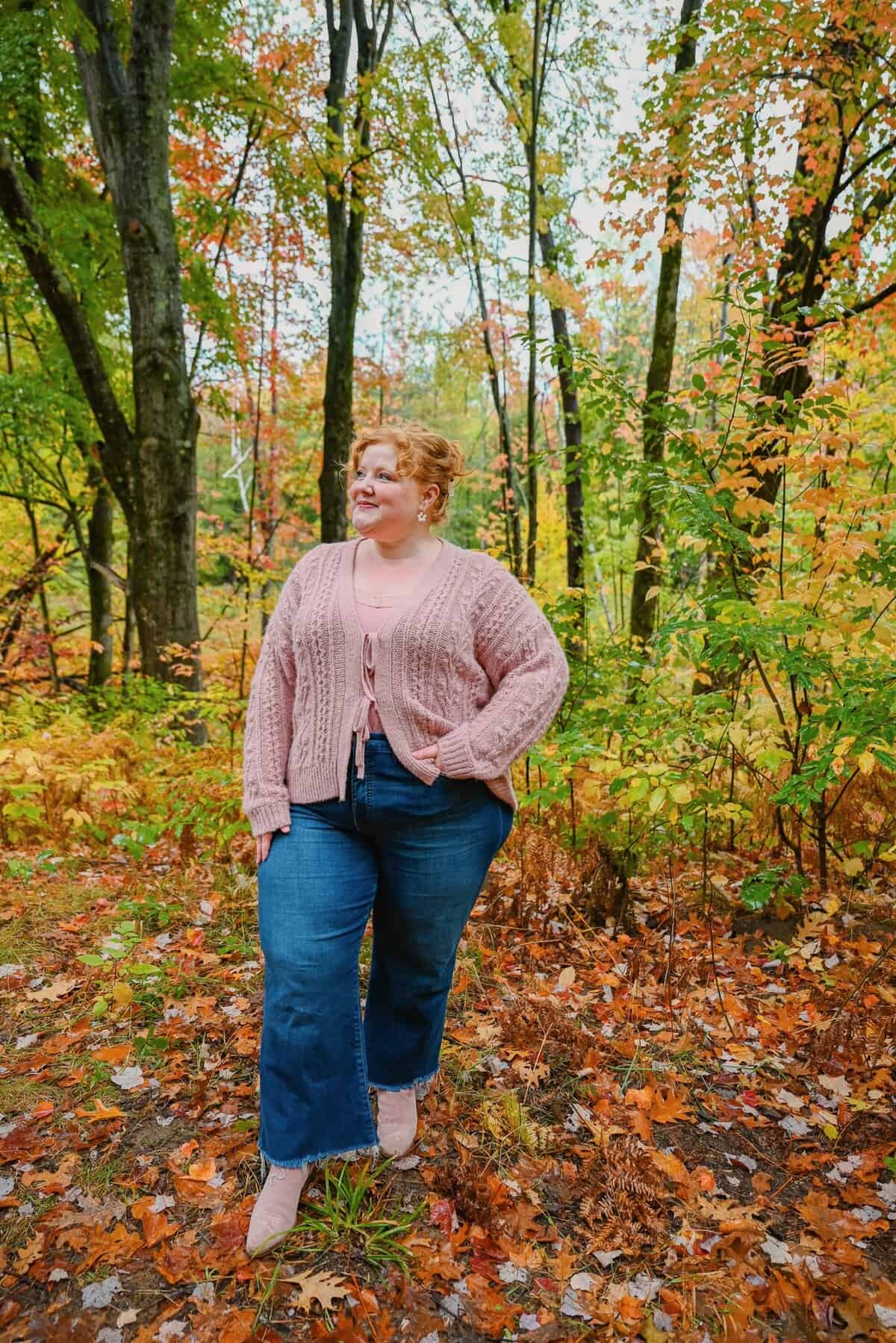 This outfit perfectly embodies the essence of chic fall fashion with a delightful pink twist. The star of the ensemble is a chunky, cable-knit cardigan in a soft, dusty pink hue that exudes warmth and comfort. Paired with classic blue jeans and matching pink booties, this look strikes an ideal balance between casual and stylish. The cardigan’s relaxed fit and open front make it a versatile piece for layering, while its feminine color adds a touch of elegance to the overall outfit. Set against the backdrop of autumn foliage, this combination showcases how a pop of pink can beautifully complement the season’s natural palette, making it a standout choice for fashion-forward fall dressing.