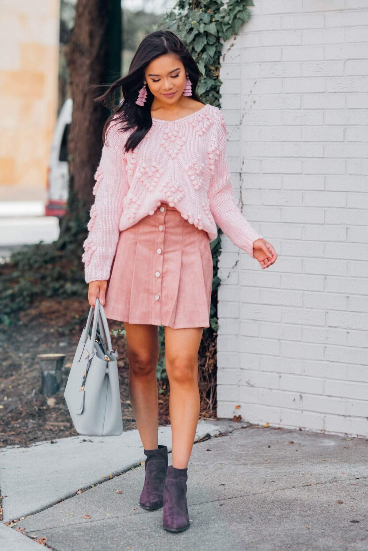 This chic ensemble perfectly embodies fall’s pink trend while maintaining a cozy autumn vibe. The textured pink sweater, adorned with delicate pom-pom details, adds depth and interest to the outfit. Paired with a button-front pink suede skirt, it creates a harmonious monochromatic look that’s both stylish and season-appropriate. The outfit is cleverly balanced with dark ankle boots and a light gray handbag, demonstrating how to incorporate pink into a fall wardrobe without sacrificing sophistication. The tassel earrings in a matching pink hue complete this head-turning look, proving that pink can be a standout color for fall fashion.