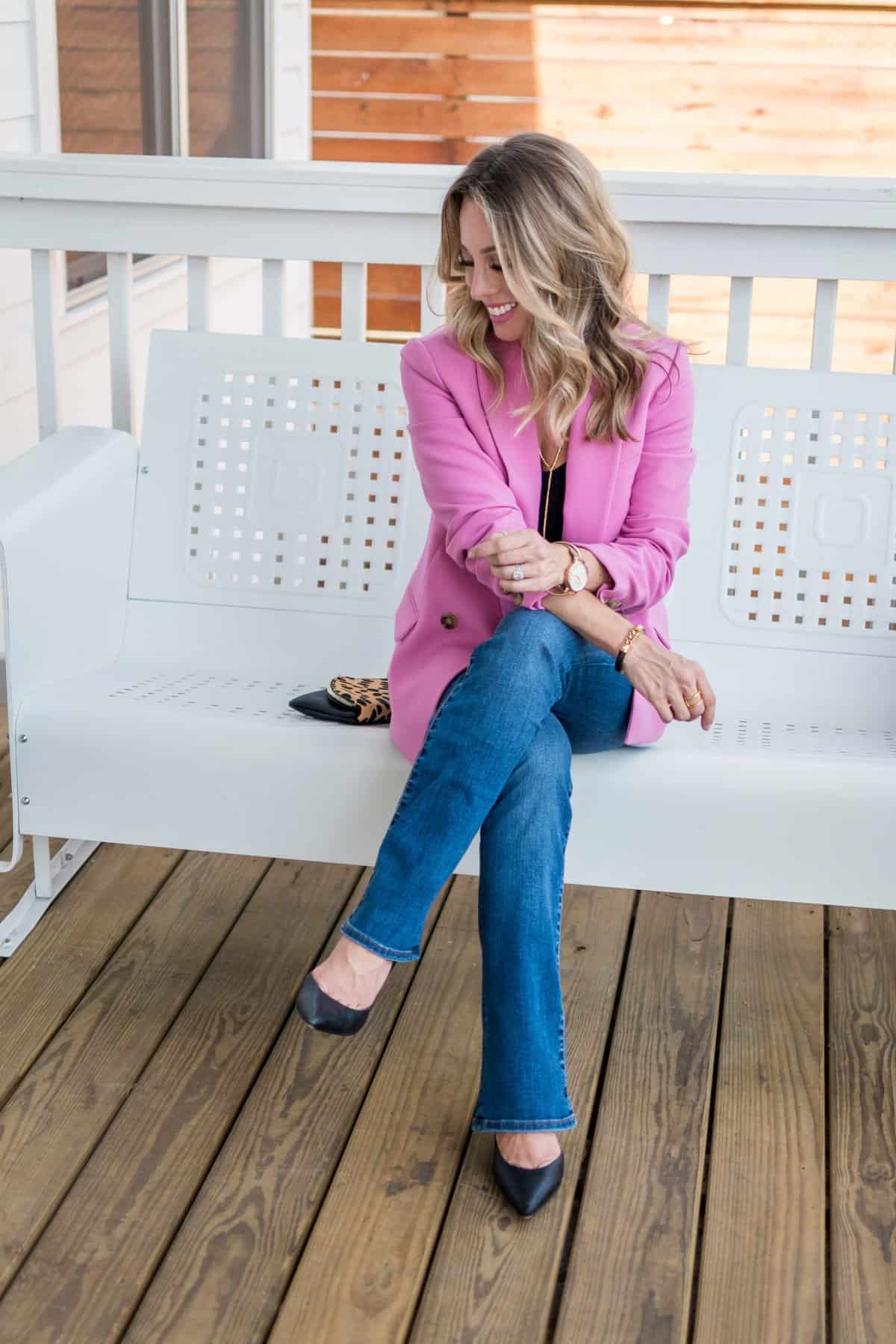 Elevate your fall wardrobe with this stunning combination of a vibrant pink blazer and classic blue jeans. The oversized, bubblegum pink blazer adds a pop of color and sophistication to a casual denim look, creating the perfect balance between chic and comfortable. The relaxed fit of the blazer paired with sleek black pumps demonstrates how to effortlessly dress up your everyday jeans for a stylish autumn ensemble. This outfit showcases how a statement pink piece can transform a simple look into a head-turning fall fashion moment, ideal for both office settings and weekend outings.