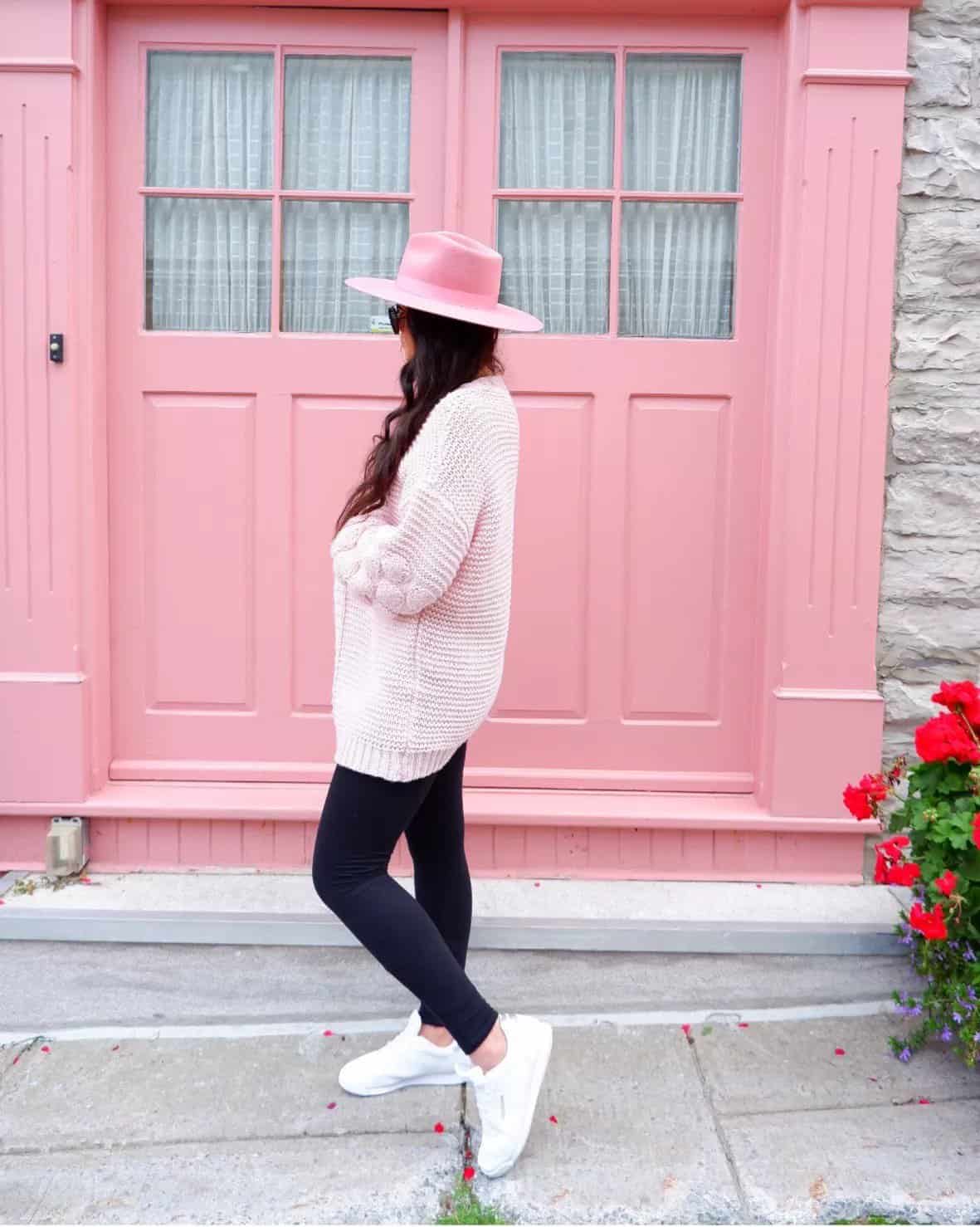 This charming fall outfit seamlessly blends comfort and style with a soft, oversized pastel pink sweater paired with a matching wide-brimmed hat. The cozy knit texture of the sweater adds warmth and visual interest, while the hat brings a touch of sophistication to the ensemble. Black leggings create a sleek silhouette, and crisp white sneakers add a casual, modern edge. This look perfectly embodies the ‘chic pink’ theme, offering a fresh take on autumnal fashion that’s sure to turn heads. The pink-on-pink coordination against the backdrop of a pink door creates a visually striking and Instagram-worthy moment, making this outfit a must-try for fashion-forward individuals this fall season.