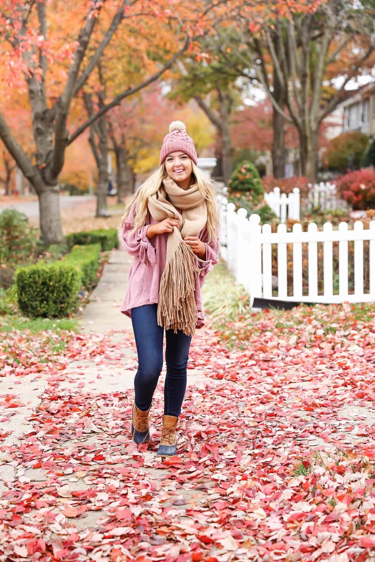 This ensemble masterfully combines comfort and style for the perfect fall look. The loose-fitting blush pink sweater adds a soft, feminine touch while providing warmth for cooler days. Paired with dark skinny jeans and sturdy duck boots, it strikes an ideal balance between cozy and chic. The outfit is elevated by thoughtful accessories: a plush beige scarf with playful fringe and a matching pink knit beanie with a cute pom-pom. This look effortlessly captures the essence of fall fashion, blending earthy neutrals with pops of pink that echo the changing leaves. It’s a versatile outfit that’s sure to turn heads whether you’re strolling through a pumpkin patch or enjoying a latte at a quaint café.