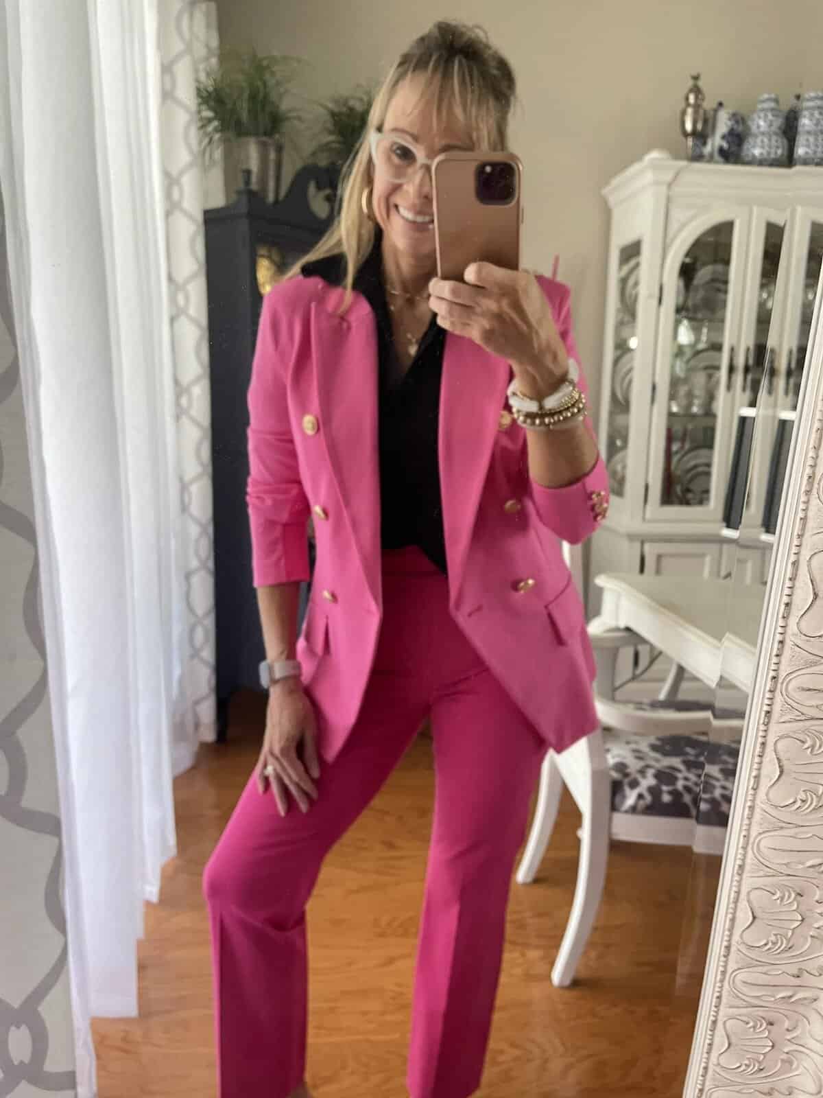 Make a striking statement this fall with a vibrant pink suit that exudes confidence and style. This ensemble features a perfectly tailored blazer with gold button details, paired with matching pink trousers for a sleek, monochromatic look. The addition of a black top underneath provides a sophisticated contrast, balancing the boldness of the pink. Accessorized with layered necklaces and bracelets, this outfit demonstrates how to incorporate a typically summer-associated color into your autumn wardrobe. The bright pink hue is sure to turn heads and lift spirits as the days grow shorter, proving that fall fashion doesn’t have to be limited to muted tones.
