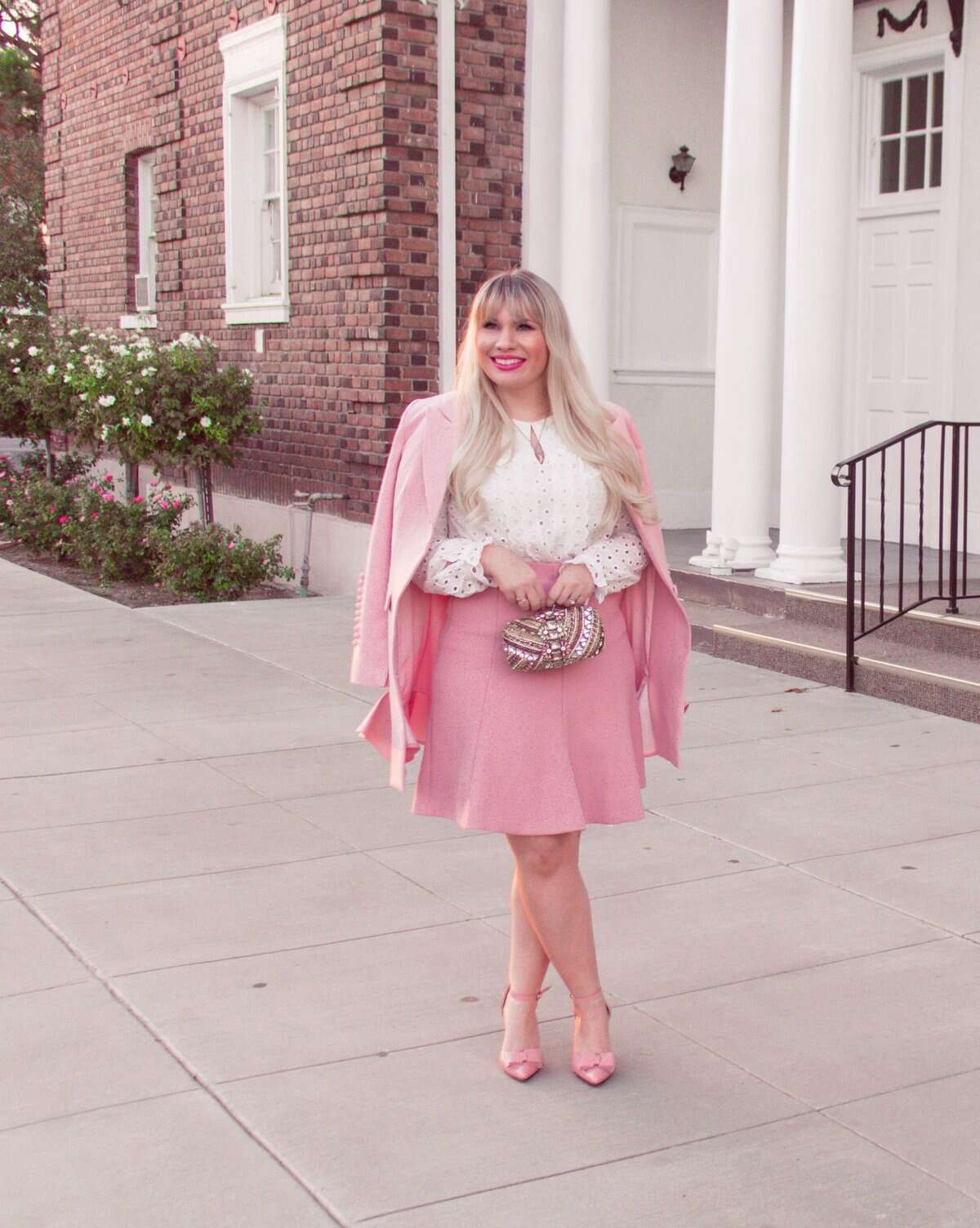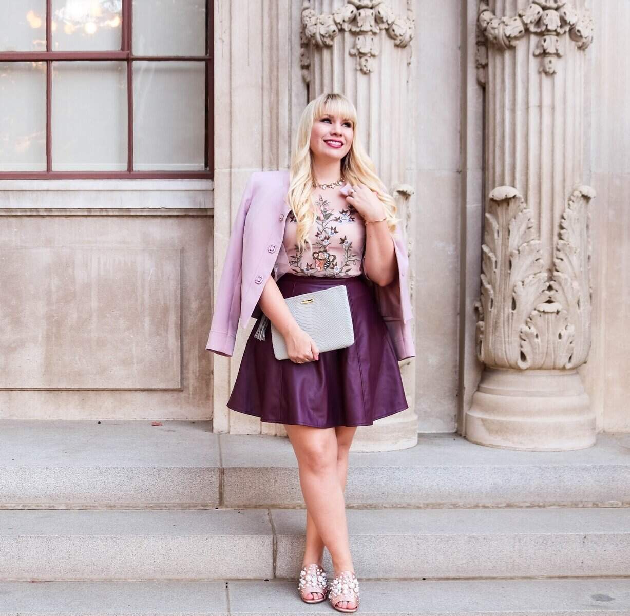 This ensemble perfectly captures the essence of chic pink fall fashion. The soft blush pink blazer draped elegantly over the shoulders adds a touch of sophistication, while the floral-embroidered top underneath introduces a delicate, feminine flair. The rich plum leather skirt provides a stunning contrast, embodying the deeper hues of autumn. Accessorized with a silvery clutch and eye-catching embellished sandals, this outfit seamlessly blends summer’s lingering warmth with fall’s approaching coolness. The combination of textures and complementary pink tones creates a head-turning look that’s both seasonally appropriate and fashion-forward.