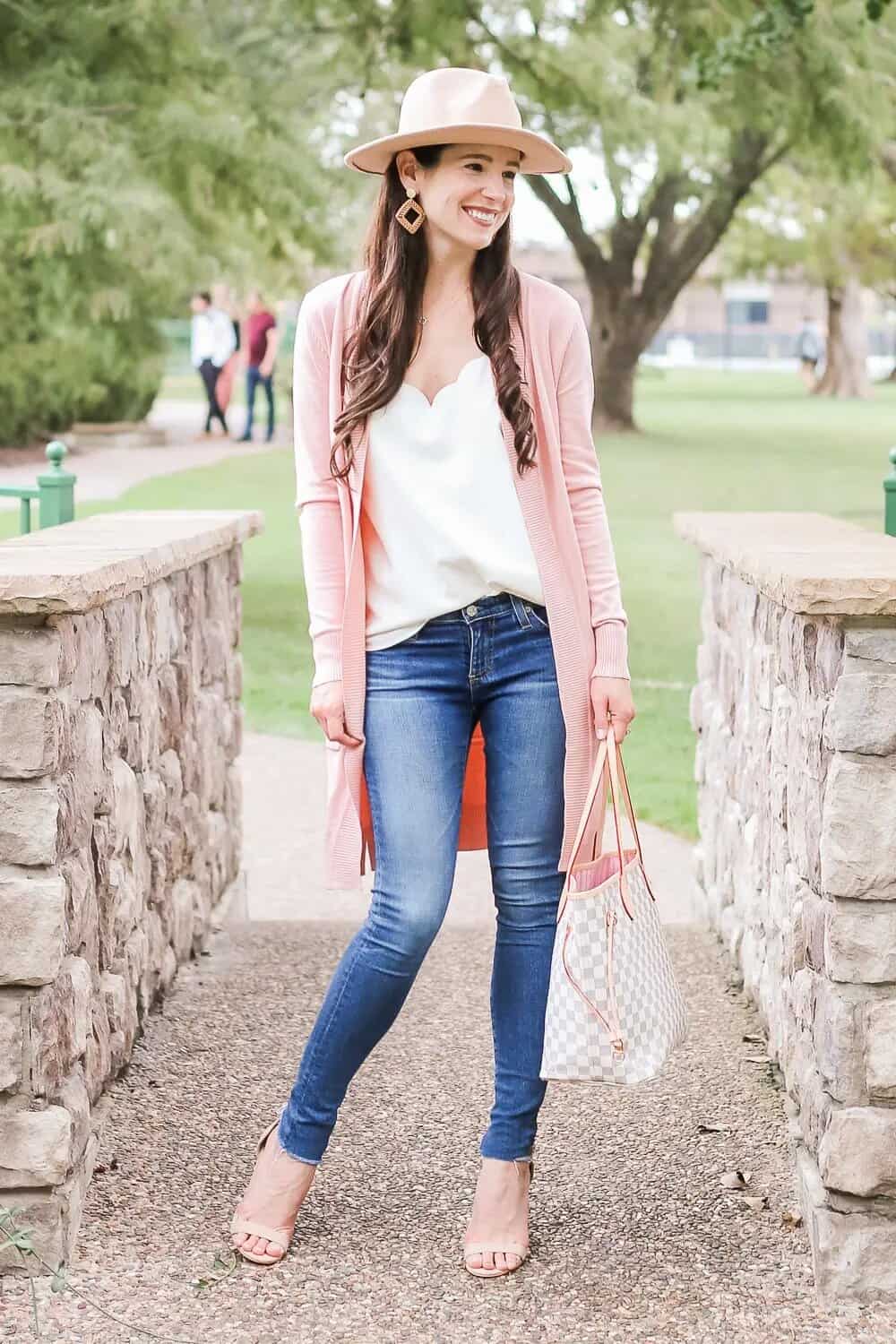 This ensemble perfectly captures the essence of chic pink fall fashion. The long, blush pink cardigan adds a soft, feminine touch to the classic combination of a white top and blue jeans. The lightweight knit makes it ideal for those crisp autumn days, offering both style and practicality. The neutral fedora hat elevates the look, giving it a fashionable edge while complementing the overall color palette. Accessorized with statement earrings and blush-toned heels, this outfit demonstrates how a touch of pink can transform a casual look into a head-turning fall ensemble. It’s a versatile combination that can easily transition from day to evening, making it a must-have for the fashion-forward autumn wardrobe.