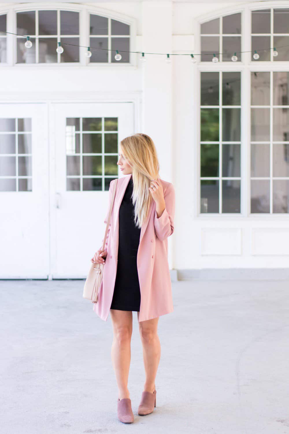 This ensemble perfectly captures the essence of chic pink fall fashion. The standout piece is a luxurious, blush pink coat that drapes elegantly over a sleek black dress, creating a striking contrast that’s both sophisticated and eye-catching. The coat’s soft hue adds a touch of feminine charm to the outfit, while its tailored silhouette maintains a polished look. Complementing the coat are matching pink suede ankle boots, which tie the look together seamlessly. The neutral-toned handbag adds a practical yet stylish element. This outfit demonstrates how a bold pink statement piece can elevate a simple black dress, making it an ideal choice for those looking to make a fashionable impact this fall season.