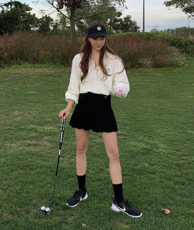 Paired with a crisp white pleated skirt and coordinating white crew socks, this outfit creates a sophisticated color palette that”s both eye-catching and timeless. The layering approach allows golfers to adjust their comfort level as temperatures fluctuate throughout their round.