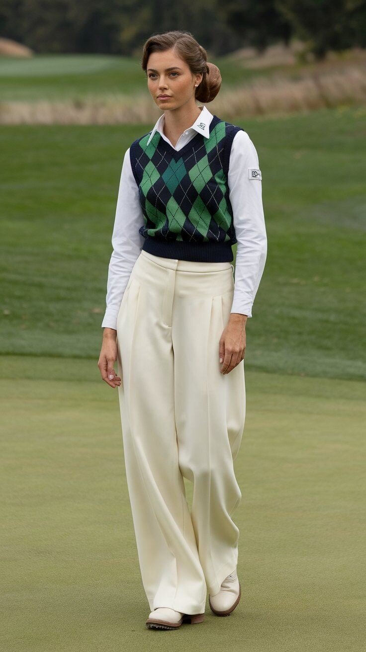 The long-sleeved sweater and coordinated accessories protect against chilly weather without restricting your swing, making this ensemble both practical and undeniably chic. This outfit proves that winter golf fashion doesn”t require sacrificing the elegant, traditional elements that make the sport so visually appealing.
