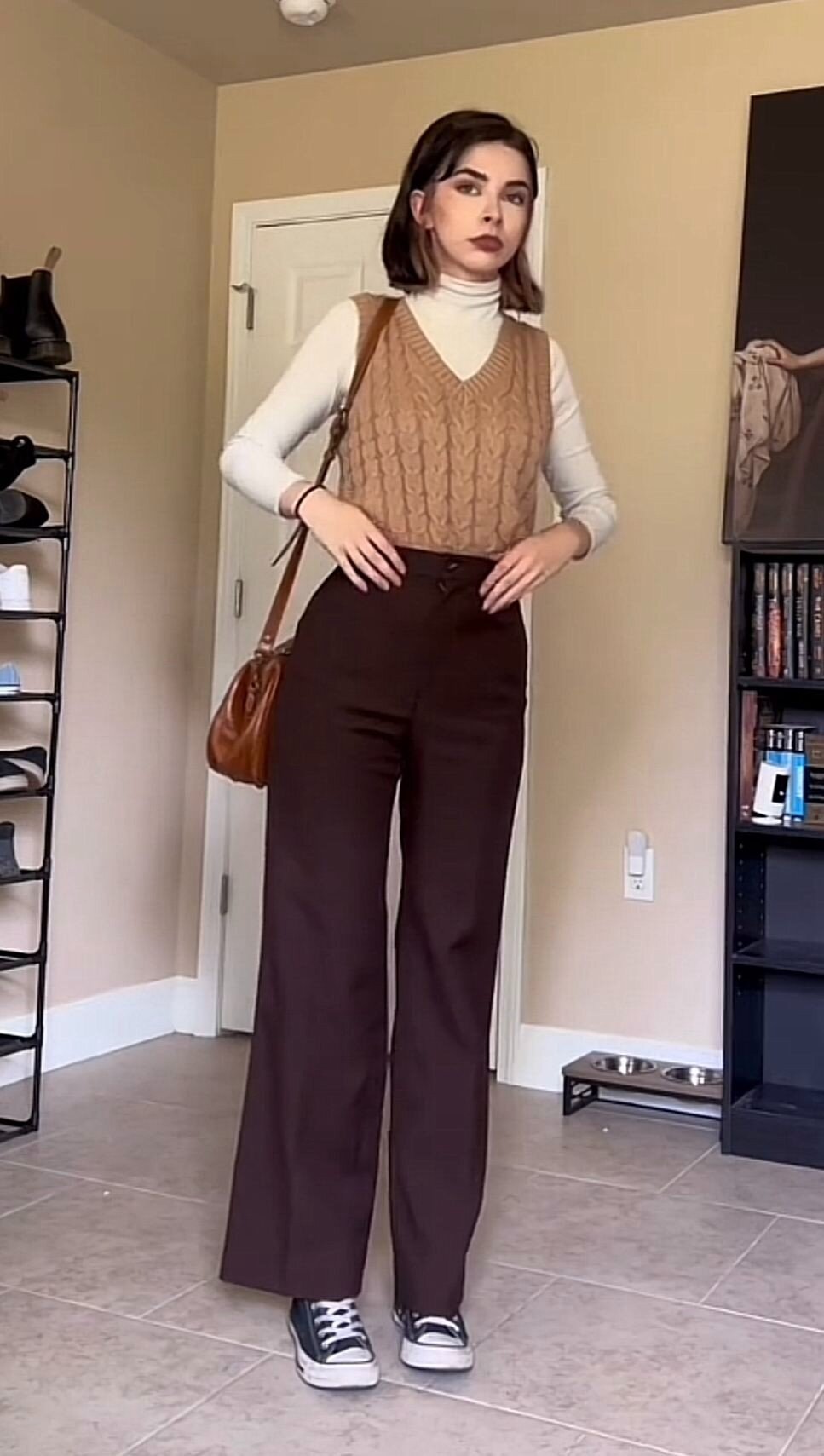 This effortlessly chic ensemble combines a warm camel cable-knit vest with a crisp white turtleneck for the perfect winter office look that feels both polished and approachable. The neutral earth-tone palette pairs beautifully with tailored brown trousers, creating a sophisticated silhouette that transitions seamlessly from desk to meeting room.