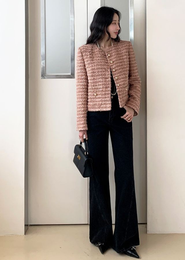 This outfit perfectly balances sophistication with approachable charm, making it ideal for the modern office. The blush pink textured tweed blazer adds a polished, feminine touch that instantly elevates your professional presence, while the classic blue jeans keep things grounded and relatable.