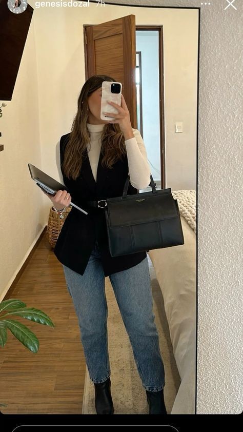 This outfit perfectly captures the essence of effortless winter office style by pairing a structured black blazer with classic blue jeans and sleek black boots. The oversized blazer adds sophistication and polish while maintaining comfort during long workdays, while the fitted jeans provide a modern, approachable edge that keeps the look from feeling too formal.
