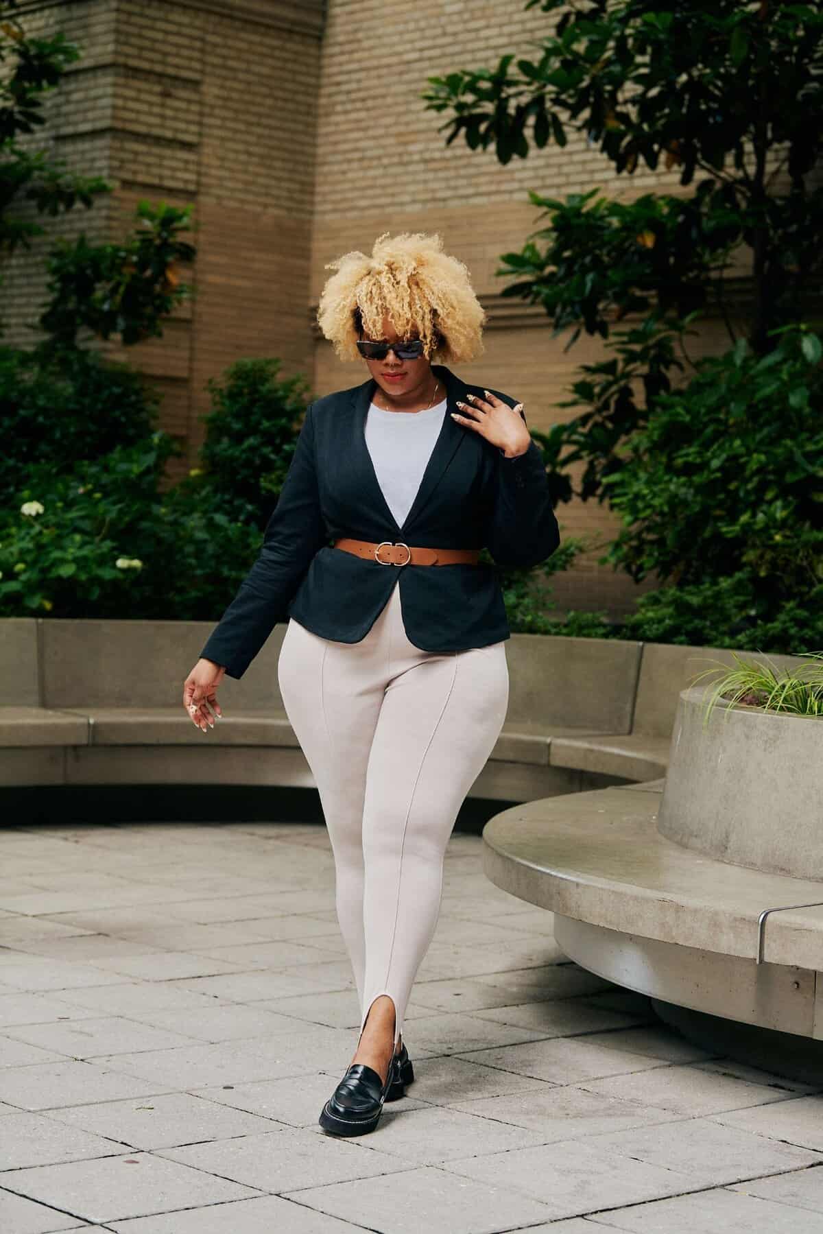 This outfit exemplifies how to elevate a classic work staple into a chic, contemporary look. The navy blazer, a timeless office essential, is given a fresh twist with a brown belt cinching the waist, creating a flattering silhouette.
