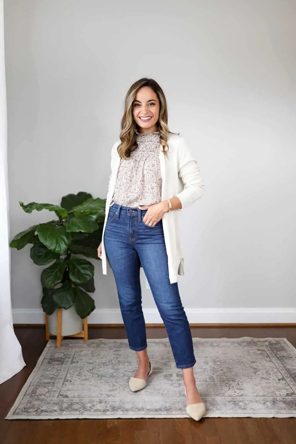 Layered over it, a crisp white cardigan provides warmth and versatility, allowing for easy adaptation to changing office temperatures. The straight-leg jeans in a medium wash offer a modern, relaxed feel while maintaining a polished appearance.