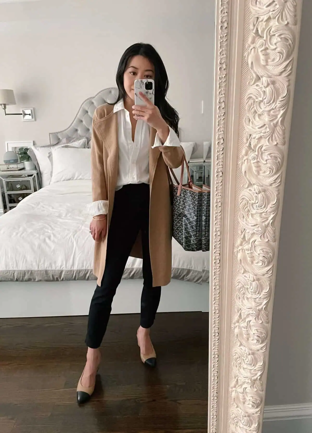 This sophisticated outfit epitomizes effortless chic for the modern professional. The long camel coat adds a touch of luxury and warmth, perfectly complementing the crisp white button-down shirt underneath.