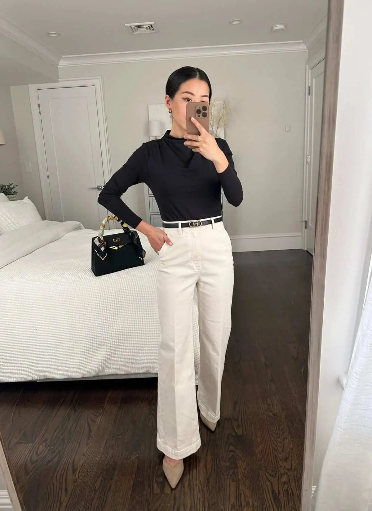 This ensemble epitomizes the perfect balance between timeless elegance and contemporary style. The crisp contrast of a black turtleneck paired with high-waisted cream trousers creates a sleek silhouette thats both professional and fashion-forward.