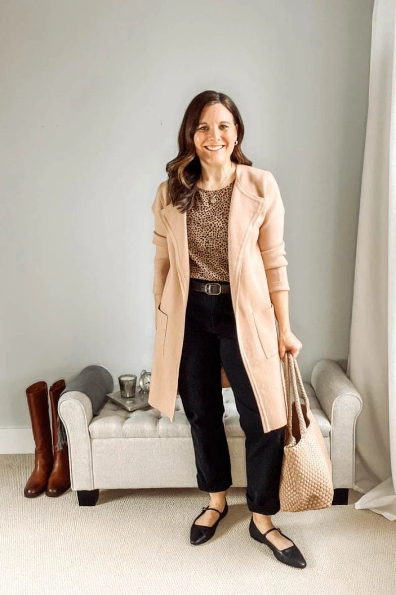 Underneath, a chic leopard print top introduces a playful yet professional element, proving that animal prints can be office-appropriate when styled thoughtfully. Black trousers and ballet flats ground the look, while a woven tote adds texture and practicality.