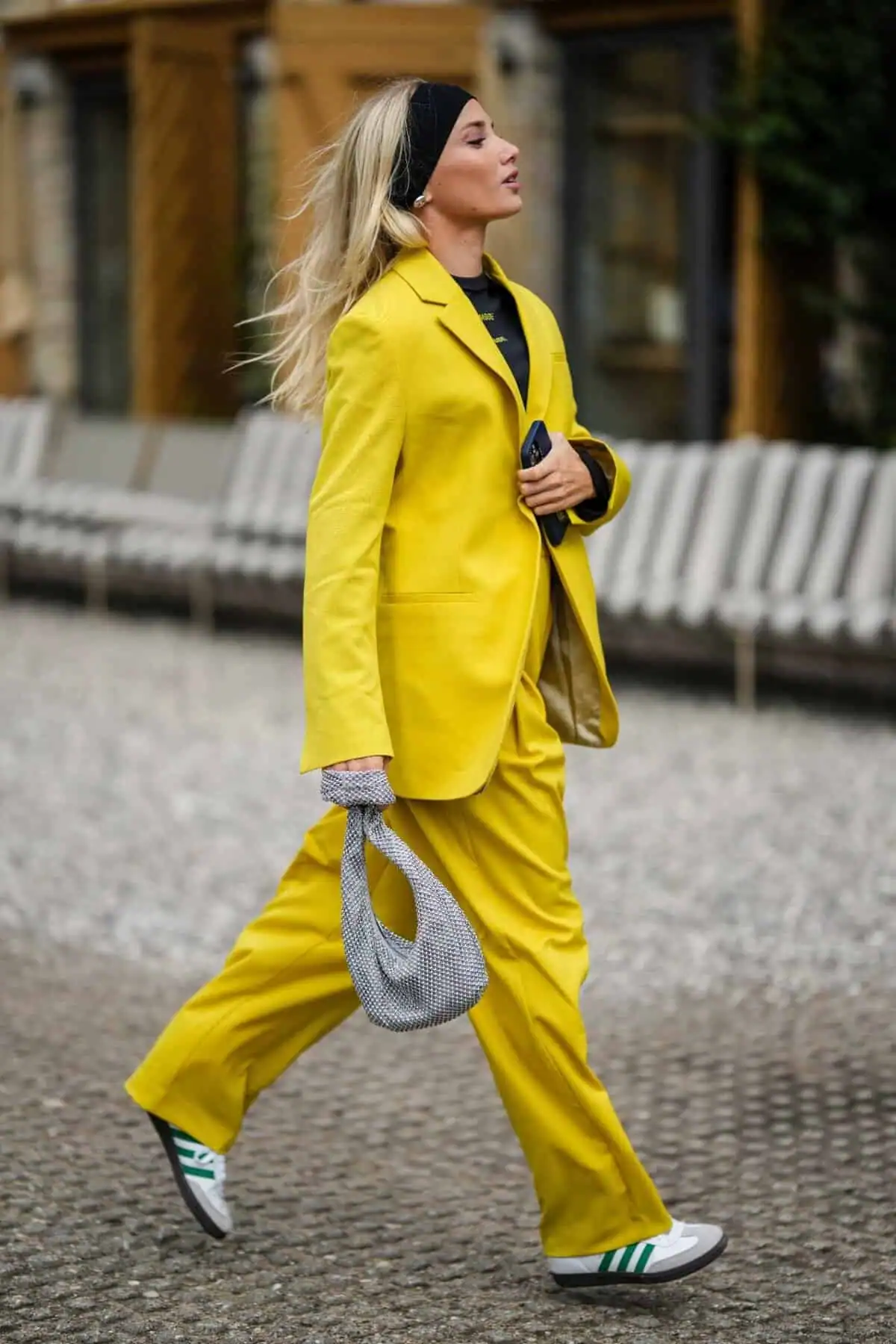 Pairing the suit with casual sneakers creates a perfect blend of professional and approachable, ideal for modern creative workplaces. The look is completed with a chic black headband and a metallic mesh handbag, adding texture and sophistication.