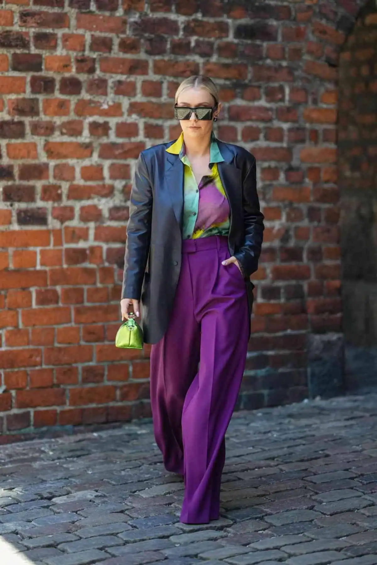 The outfit is perfectly balanced, combining professional silhouettes with daring color choices. Accessorized with futuristic sunglasses and a pop of neon green in the handbag, this look exudes confidence and fashion-forward thinking.