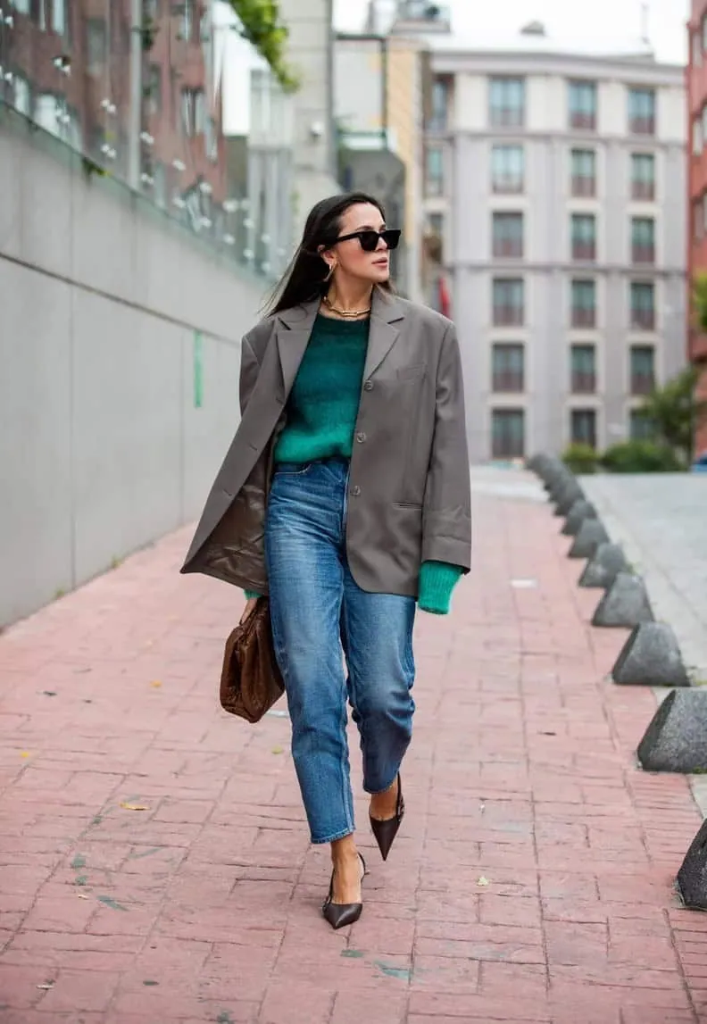 Elevate your work attire with this striking combination of an oversized gray blazer and relaxed-fit jeans. The emerald green sweater adds a vibrant pop of color, while the pointed black heels bring a touch of sophistication.