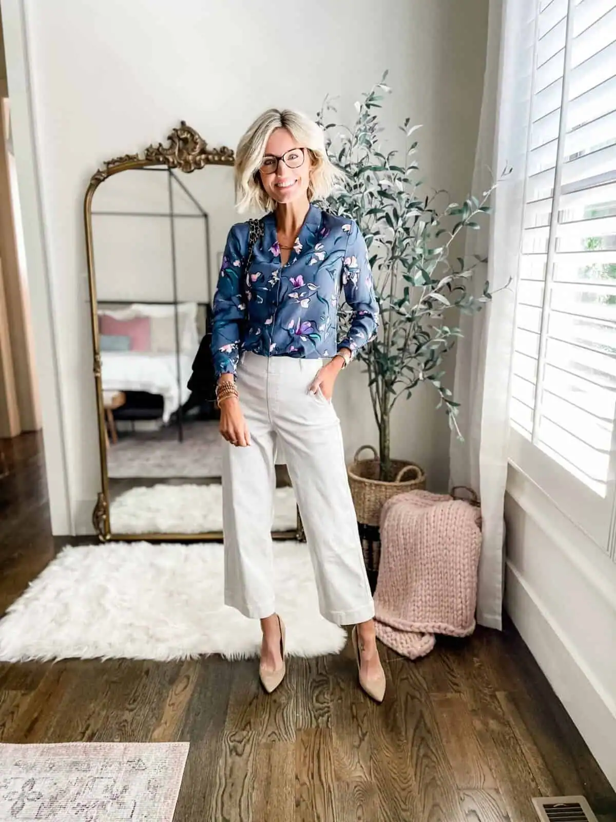 This ensemble effortlessly combines comfort and style, perfect for making a lasting impression at the office. The navy floral blouse adds a touch of femininity and sophistication, while the crisp white wide-leg trousers create a polished, elongating silhouette.