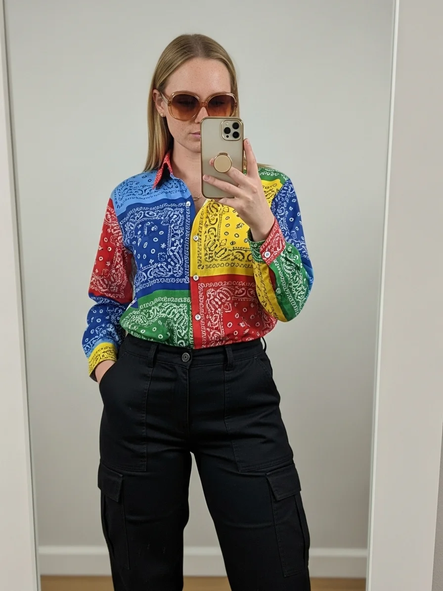 Bandana Print Shirt, Black Cargo Pants, and Retro Sunglasses
