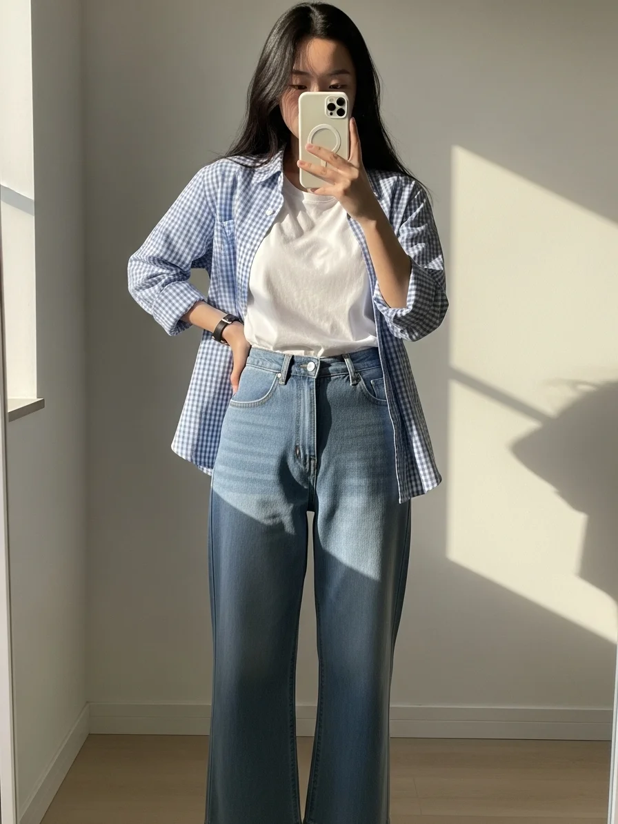 White T-Shirt with Gingham Button-Down and Fashion-Forward Barrel Jeans