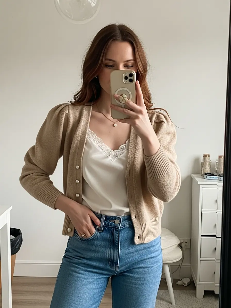 This ensemble balances comfort with elegance. The puff-sleeve cardigan adds volume and drama to the upper body.